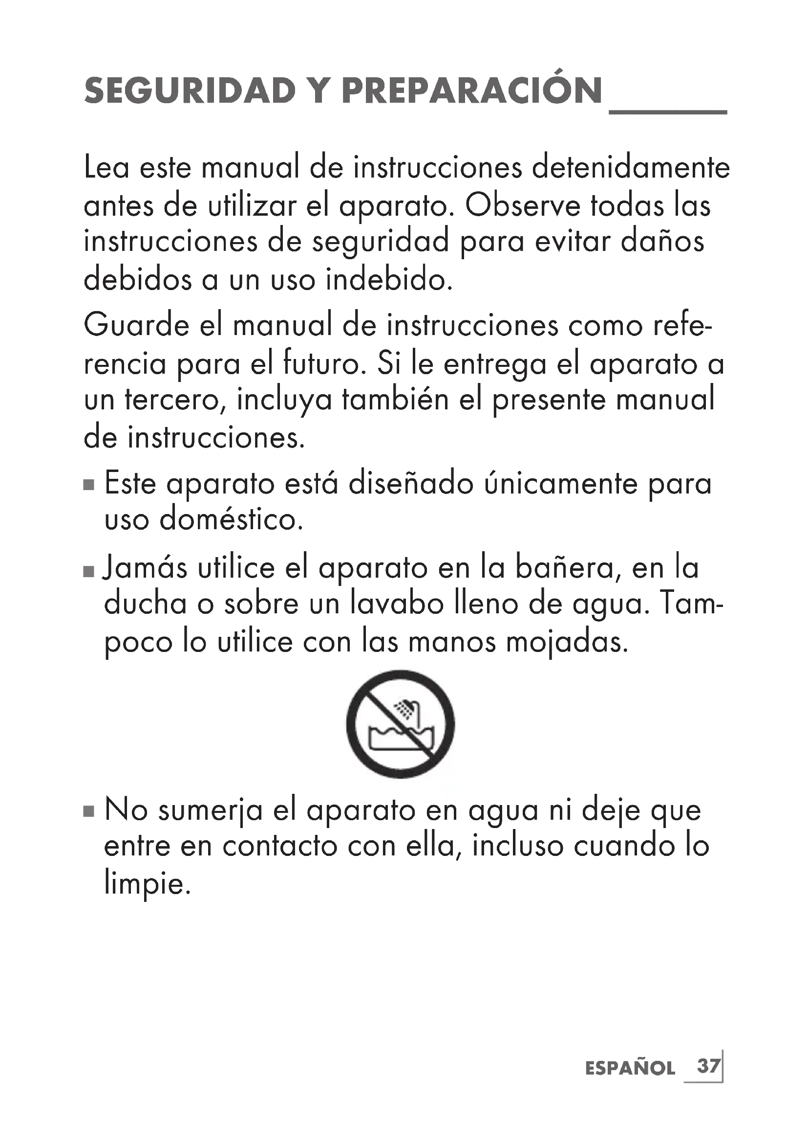 Jamás utilice el aparato en la bañera, en la ducha o sobre un lavabo lleno de agua. Tam- poco lo utilice con las manos mojadas.
