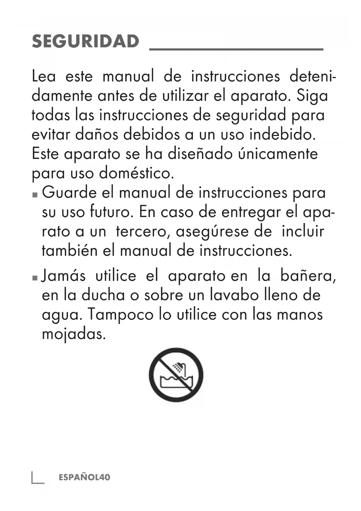 SEGURIDAD __________________ Lea este manual de instrucciones deteni- damente antes de utilizar el aparato. Siga todas las instrucciones de seguridad para evitar daños debidos a un uso indebido. Este aparato se ha diseñado únicamente para uso doméstico.