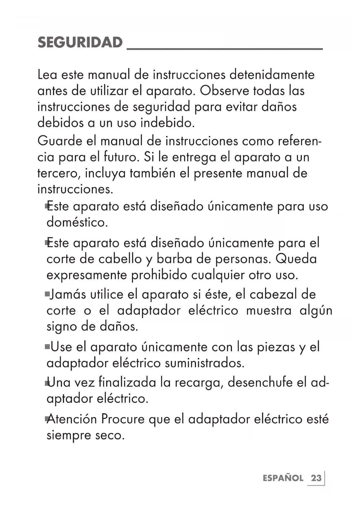 SEGURIDAD __________________________ Lea este manual de instrucciones detenidamente antes de utilizar el aparato. Observe todas las instrucciones de seguridad para evitar daños debidos a un uso indebido. Guarde el manual de instrucciones como referen- cia para el futuro. Si le entrega el aparato a un tercero, incluya también el presente manual de instrucciones.