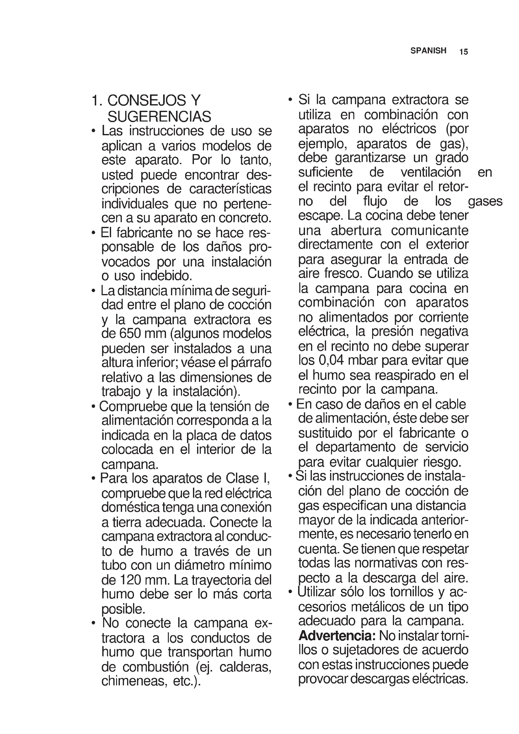 - Si la campana extractora se utiliza en combinación con aparatos no eléctricos (por ejemplo, aparatos de gas), debe garantizarse un grado VX¿FLHQWH GH YHQWLODFLyQ HQ el recinto para evitar el retor- QR GHO ÀXMR GH ORV JDVHV GH escape. La cocina debe tener una abertura comunicante directamente con el exterior para asegurar la entrada de aire fresco. Cuando se utiliza la campana para cocina en combinación con aparatos no alimentados por corriente eléctrica, la presión negativa en el recinto no debe superar los 0,04 mbar para evitar que el humo sea reaspirado en el recinto por la campana.