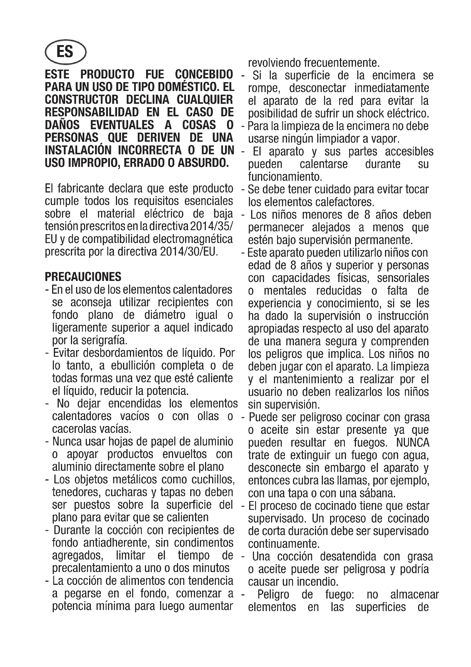 USO IMPROPIO, ERRADO O ABSURDO. El fabricante declara que este producto cumple todos los requisitos esenciales sobre el material eléctrico de baja tensión prescritos en la directiva 2014/35/ EU y de compatibilidad electromagnética prescrita por la directiva 2014/30/EU. PRECAUCIONES - En el uso de los elementos calentadores se aconseja utilizar recipientes con fondo plano de diámetro igual o ligeramente superior a aquel indicado por la serigrafía. - Evitar desbordamientos de líquido. Por lo tanto, a ebullición completa o de todas formas una vez que esté caliente el líquido, reducir la potencia. - No dejar encendidas los elementos calentadores vacíos o con ollas o cacerolas vacías. - Nunca usar hojas de papel de aluminio o apoyar productos envueltos con aluminio directamente sobre el plano - Los objetos metálicos como cuchillos, tenedores, cucharas y tapas no deben ser puestos sobre la superficie del plano para evitar que se calienten - Durante la cocción con recipientes de fondo antiadherente, sin condimentos agregados, limitar el tiempo de precalentamiento a uno o dos minutos - La cocción de alimentos con tendencia a pegarse en el fondo, comenzar a potencia mínima para luego aumentar revolviendo frecuentemente. - Si la superficie de la encimera se rompe, desconectar inmediatamente el aparato de la red para evitar la posibilidad de sufrir un shock eléctrico. - Para la limpieza de la encimera no debe usarse ningún limpiador a vapor. - El aparato y sus partes accesibles pueden calentarse durante su funcionamiento. - Se debe tener cuidado para evitar tocar los elementos calefactores. - Los niños menores de 8 años deben permanecer alejados a menos que estén bajo supervisión permanente. - Este aparato pueden utilizarlo niños con edad de 8 años y superior y personas con capacidades físicas, sensoriales o mentales reducidas o falta de experiencia y conocimiento, si se les ha dado la supervisión o instrucción apropiadas respecto al uso del aparato de una manera segura y comprenden los peligros que implica. Los niños no deben jugar con el aparato. La limpieza y el mantenimiento a realizar por el usuario no deben realizarlos los niños sin supervisión. - Puede ser peligroso cocinar con grasa o aceite sin estar presente ya que pueden resultar en fuegos. NUNCA trate de extinguir un fuego con agua, desconecte sin embargo el aparato y entonces cubra las llamas, por ejemplo, con una tapa o con una sábana. - El proceso de cocinado tiene que estar supervisado. Un proceso de cocinado de corta duración debe ser supervisado continuamente. - Una cocción desatendida con grasa o aceite puede ser peligrosa y podría causar un incendio. - Peligro de fuego: no almacenar elementos en las superficies de EScocción. - Utilizar sólo protectores de encimera diseñados por el fabricante del aparato de cocción o indicado por el fabricante en las instrucciones para el uso como adecuado o protectores de encimera incorporados en el aparato. El uso de protectores inadecuados puede causar accidentes. Instale en el cableado fijo un medio de desconexión de la red eléctrica con una separación de contacto en todos los polos que permita una desconexión completa en condiciones de sobretensión de categoría III, de acuerdo con la normativa de cableado. El enchufe o el interruptor omnipolar tienen que ser fácilmente alcanzables con el aparato instalado. Este aparato no está previsto para hacerlo funcionar por medio de un temporizador externo o sistema de control remoto separado. El constructor declina cualquier responsabilidad en el caso de que lo dicho arriba y las usuales normas contra los infortunios no sean respetados. Si el cable de alimentación se daña, hágalo sustituir por el fabricante, por un centro de asistencia técnica autorizado o por un técnico de competencia similar, a fin de prevenir todo tipo de riesgos. Instrucciones para el usuario Instalación Todas las operaciones relativas a la instalación (conexión eléctrica) tienen que ser efectuadas por personal cualificado según las normas vigentes. Para las instrucciones específicas véase la parte reservada al instalador. Utilización