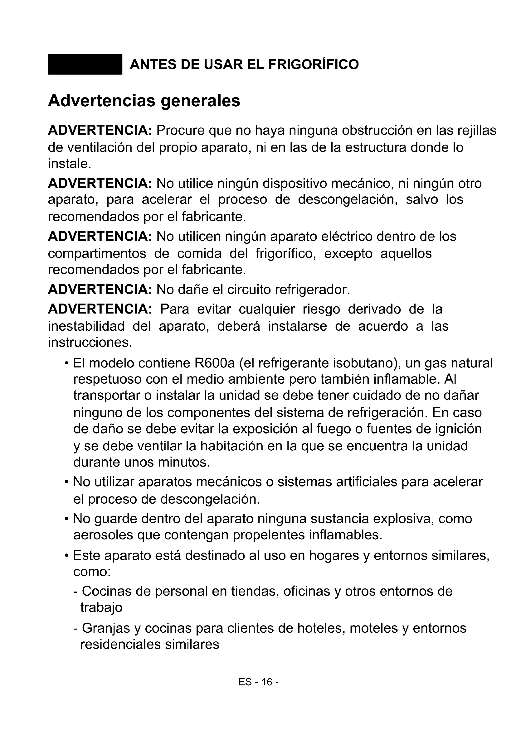 - LOS COMPONENTES DEL APARATO Y COMPARTIMENTOS ES - 16 - ANTES DE USAR EL FRIGORÍFICO PARTE -1. Advertencias generales ADVERTENCIA: Procure que no haya ninguna obstrucción en las rejillas de ventilación del propio aparato, ni en las de la estructura donde lo instale. ADVERTENCIA: No utilice ningún dispositivo mecánico, ni ningún otro aparato, para acelerar el proceso de descongelación, salvo los recomendados por el fabricante. ADVERTENCIA: No utilicen ningún aparato eléctrico dentro de los compartimentos de comida del frigorífico, excepto aquellos recomendados por el fabricante. ADVERTENCIA: No dañe el circuito refrigerador. ADVERTENCIA: Para evitar cualquier riesgo derivado de la inestabilidad del aparato, deberá instalarse de acuerdo a las instrucciones. p. 28
