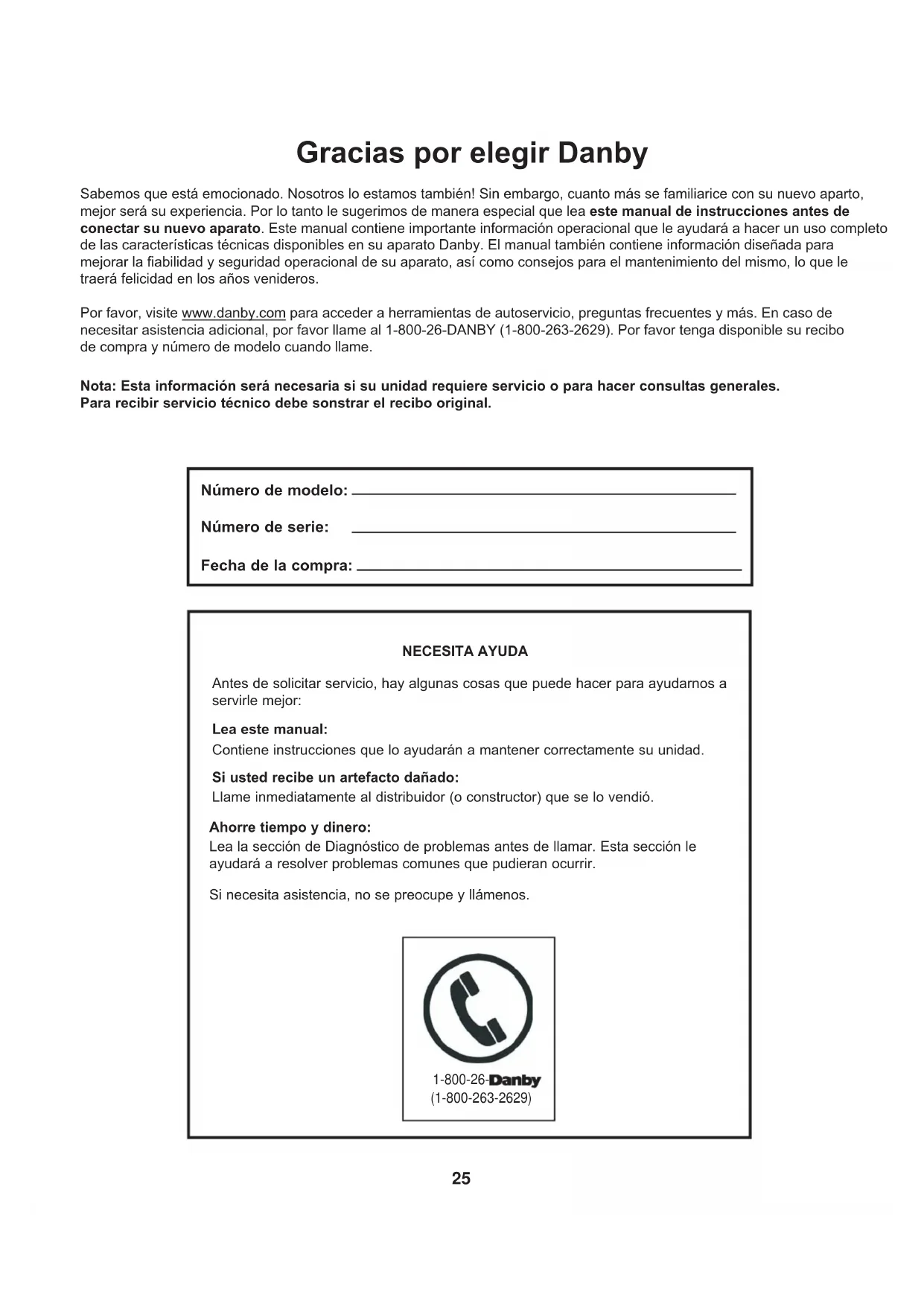 Gracias por elegir Danby Sabemos que está emocionado. Nosotros lo estamos también! Sin embargo, cuanto más se familiarice con su nuevo aparto, mejor será su experiencia. Por lo tanto le sugerimos de manera especial que lea este manual de instrucciones antes de conectar su nuevo aparato. Este manual contiene importante información operacional que le ayudará a hacer un uso completo de las características técnicas disponibles en su aparato Danby. El manual también contiene información diseñada para mejorar la fiabilidad y seguridad operacional de su aparato, así como consejos para el mantenimiento del mismo, lo que le traerá felicidad en los años venideros. Por favor, visite www.danby.com para acceder a herramientas de autoservicio, preguntas frecuentes y más. En caso de necesitar asistencia adicional, por favor llame al 1-800-26-DANBY (1-800-263-2629). Por favor tenga disponible su recibo de compra y número de modelo cuando llame. Nota: Esta información será necesaria si su unidad requiere servicio o para hacer consultas generales. Para recibir servicio técnico debe sonstrar el recibo original. Número de modelo: Número de serie: Fecha de la compra: NECESITA AYUDA Antes de solicitar servicio, hay algunas cosas que puede hacer para ayudarnos a servirle mejor: Lea este manual: Contiene instrucciones que lo ayudarán a mantener correctamente su unidad. Si usted recibe un artefacto dañado: Llame inmediatamente al distribuidor (o constructor) que se lo vendió. Ahorre tiempo y dinero: Lea la sección de Diagnóstico de problemas antes de llamar. Esta sección le ayudará a resolver problemas comunes que pudieran ocurrir. Si necesita asistencia, no se preocupe y llámenos. Tel: 1-800-26- (1-800-263-2629)Instrucciones de seguridad importantes LEA Y SIGA TODAS LAS INSTRUCCIONES DE SUGERIDAD NOTA Las instrucciones de emitidas en este manual no tienen como objetivo cubrir todas las posibles condiciones y situaciones que puedan tener lugar. Las personas que instalan, realizan el mantenimiento u operan el aparato deben tener precaución y cuidado. No instalar, realizar el mantenimiento u operar el equipo de acuerdo con las instrucciones del fabricante puede llevar a condiciones que pueden producir lesiones personales y daño a su unidad o daños materiales. Comuníquese con su vendedor, agente de servicio o con el fabricante ante problemas o condiciones que no comprende totalmente. Para comunicarse con el Servicio al cliente de Danby, llame al (1-800-263-2629).