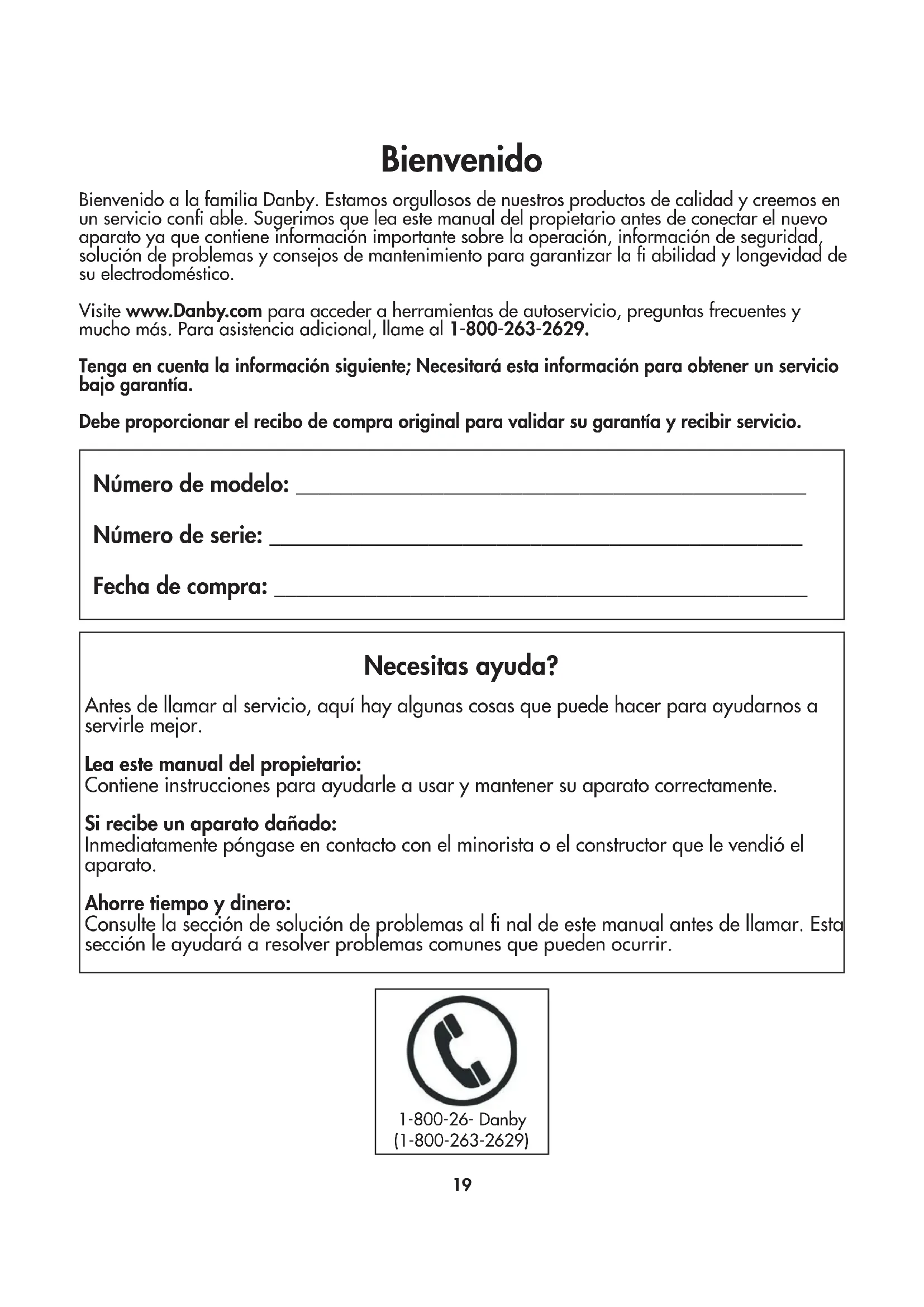 8) Improper Installation (ie. Building-in of a free standing appliance or using an appliance outdoors that is not approved for out door application). Proof of purchase date will be required for warranty claims; so, please retain bills of sale. In the event warranty service is required, present this document to our AUTHORIZED SERVICE DEPOT.Danby Products LimitedPO Box 1778, Guelph, Ontario, Canada N1H 6Z9Telephone: (519) 837-0920 FAX: (519) 837-0449Danby Products Inc.PO Box 669, Findlay, Ohio, U.S.A. 45840Telephone: (419) 425-8627 FAX: (419) 425-862904/09 1-800-263-2629 Warranty ServiceIn-home Durante los primeros veinticuatro (24) meses, cualquier parte en buen estado de este producto que resulte defectuosa, incluyendo cualquier sistema sellado, será reparado o reemplazado, a opción del fabricante, sin cargo para el comprador original.Póngase en contacto con el distribuidor donde adquirió el electrodoméstico o póngase en contacto con el centro de servicio autorizado más cercano de Danby, donde el servicio debe ser realizado por un técnico cualificado. Si el servicio es realizado por cualquier persona que no sea un depósito de servicio autorizado, todas las obligaciones de Danby bajo esta garantía serán nulas. Es responsabilidad del comprador transportar el aparato al centro de servicio autorizado más cercano. Primeros 24 mesesPara obtener servicio