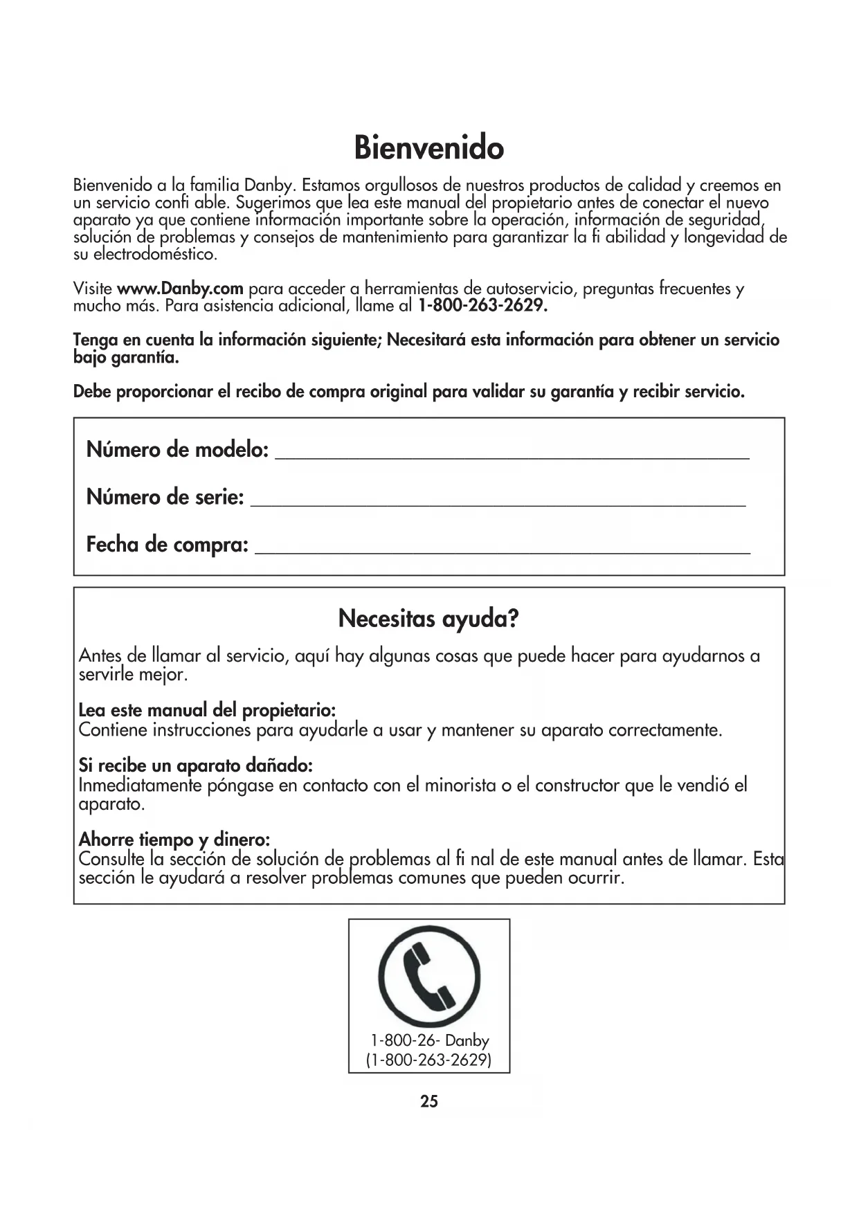 8) Improper Installation (ie. Building-in of a free standing appliance or using an appliance outdoors that is not approved for out door application). Proof of purchase date will be required for warranty claims; so, please retain bills of sale. In the event warranty service is required, present this document to our AUTHORIZED SERVICE DEPOT.Danby Products LimitedPO Box 1778, Guelph, Ontario, Canada N1H 6Z9Telephone: (519) 837-0920 FAX: (519) 837-0449Danby Products Inc.PO Box 669, Findlay, Ohio, U.S.A. 45840Telephone: (419) 425-8627 FAX: (419) 425-862904/09 1-800-263-2629 Warranty ServiceIn-home Durante los primeros veinticuatro (24) meses, cualquier parte en buen estado de este producto que resulte defectuosa, incluyendo cualquier sistema sellado, será reparado o reemplazado, a opción del fabricante, sin cargo para el comprador original. Danby se reserva el derecho de limitar la cobertura de "Servicio en Domicilio" sujeto a la proximidad de un Taller de Servicio Autorizado. Para todo artefacto que requiera servicio fuera del área limitada de "Servicio en Domicilio", el cliente será responsable por transportar dicho artefacto hasta el Taller de Servicio Autorizado mas cercano. Si el electrodoméstico está instalado en un lugar que se encuentra a 100 kilómetros (62 millas) o más del centro de servicios más cercano, se debe llevar la unidad al Centro de servicios Danby autorizado más cercano, ya que dicho servicio sólo puede realizarlo un técnico calificado y certificado por Danby para prestar servicios de garantía. Los cargos por transporte desde y hacia el lugar en que se efectúe el servicio técnico no están cubiertos por esta garantía y son de responsabilidad del comprador. Primeros 24 mesesPara obtener servicioLímites del serviciotécnico a domicilio