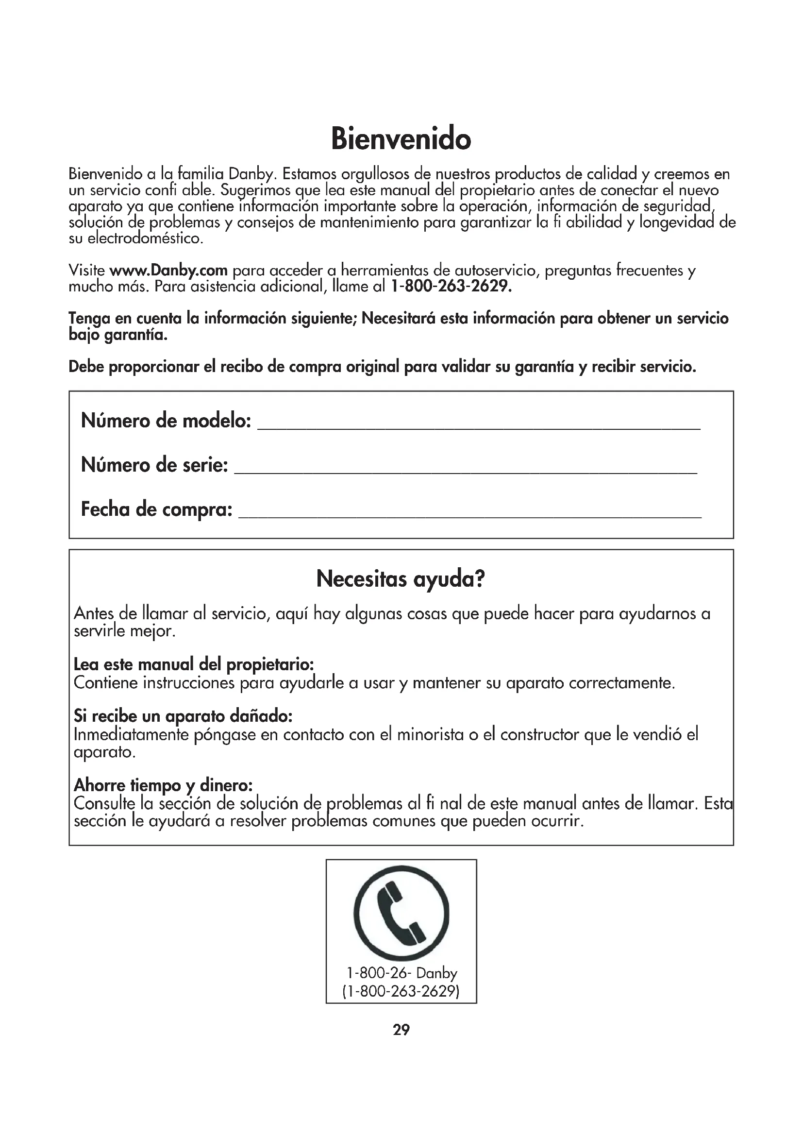 8) Installation inappropriée (par exemple, encastrement d'un appareil autoportant, ou utilisation extérieure d'un appareil non conçu à cet effet, y compris, mais sans s'y limiter: les garages, les patios, les porches ou ailleurs qui ne sont pas correctement isolés ou climatisés). La preuve de la date d'achat sera requise pour les réclamations de garantie; Conserver les factures de vente. Dans le cas où un service de garantie est requis, présentez la preuve d'achat à notre dépôt de service agréé. Service sous garantie Service au domicile Danby Products Limited PO Box 1778, Guelph, Ontario, Canada N1H 6Z9 Téléphone : (519) 837-0920 Télécopieur: (519) 837-0449 Danby Products Inc. PO Box 669, Findlay, Ohio, U.S.A. 45840 Téléphone: (419) 425-8627 Télécopieur: (419) 425-8629 1-800-263-2629 04/171-800-26- Danby(1-800-263-2629) Bienvenido Bienvenido a la familia Danby. Estamos orgullosos de nuestros productos de calidad y creemos en un servicio confi able. Sugerimos que lea este manual del propietario antes de conectar el nuevo aparato ya que contiene información importante sobre la operación, información de seguridad, solución de problemas y consejos de mantenimiento para garantizar la fi abilidad y longevidad de su electrodoméstico. Visite www.Danby.com para acceder a herramientas de autoservicio, preguntas frecuentes y mucho más. Para asistencia adicional, llame al 1-800-263-2629. Tenga en cuenta la información siguiente; Necesitará esta información para obtener un servicio bajo garantía. Debe proporcionar el recibo de compra original para validar su garantía y recibir servicio. Número de modelo: _____________________________________________ Número de serie: _______________________________________________ Fecha de compra: _______________________________________________ Necesitas ayuda? Antes de llamar al servicio, aquí hay algunas cosas que puede hacer para ayudarnos a servirle mejor. Lea este manual del propietario: Contiene instrucciones para ayudarle a usar y mantener su aparato correctamente. Si recibe un aparato dañado: Inmediatamente póngase en contacto con el minorista o el constructor que le vendió el aparato. Ahorre tiempo y dinero: Consulte la sección de solución de problemas al fi nal de este manual antes de llamar. Esta sección le ayudará a resolver problemas comunes que pueden ocurrir.