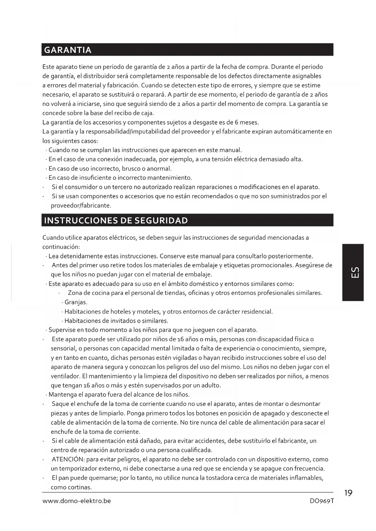 DIRECTRICES MEDIOAMBIENTALES El símbolo en el producto o en el embalaje indica que este producto no puede ser tratado como residuo doméstico. Se debe llevar a un lugar en el que se reciclan equipos eléctricos y electrónicos. Si se asegura de que este producto se desecha correctamente, usted ayudará a evitar posibles consecuencias negativas para las personas y el medio ambiente que serían causadospor un tratamiento de residuos inadecuado. Para obtener información más detallada sobre el reciclaje de este producto, póngase en contacto con su ayuntamiento, o con la empresa o departamento responsable del servicio de recogida de basura doméstica, o con la tienda donde adquirió el producto. El material de embalaje es reciclable. Trate el embalaje de una manera medioambientalmente responsable.23 DO969T www.domo-elektro.be