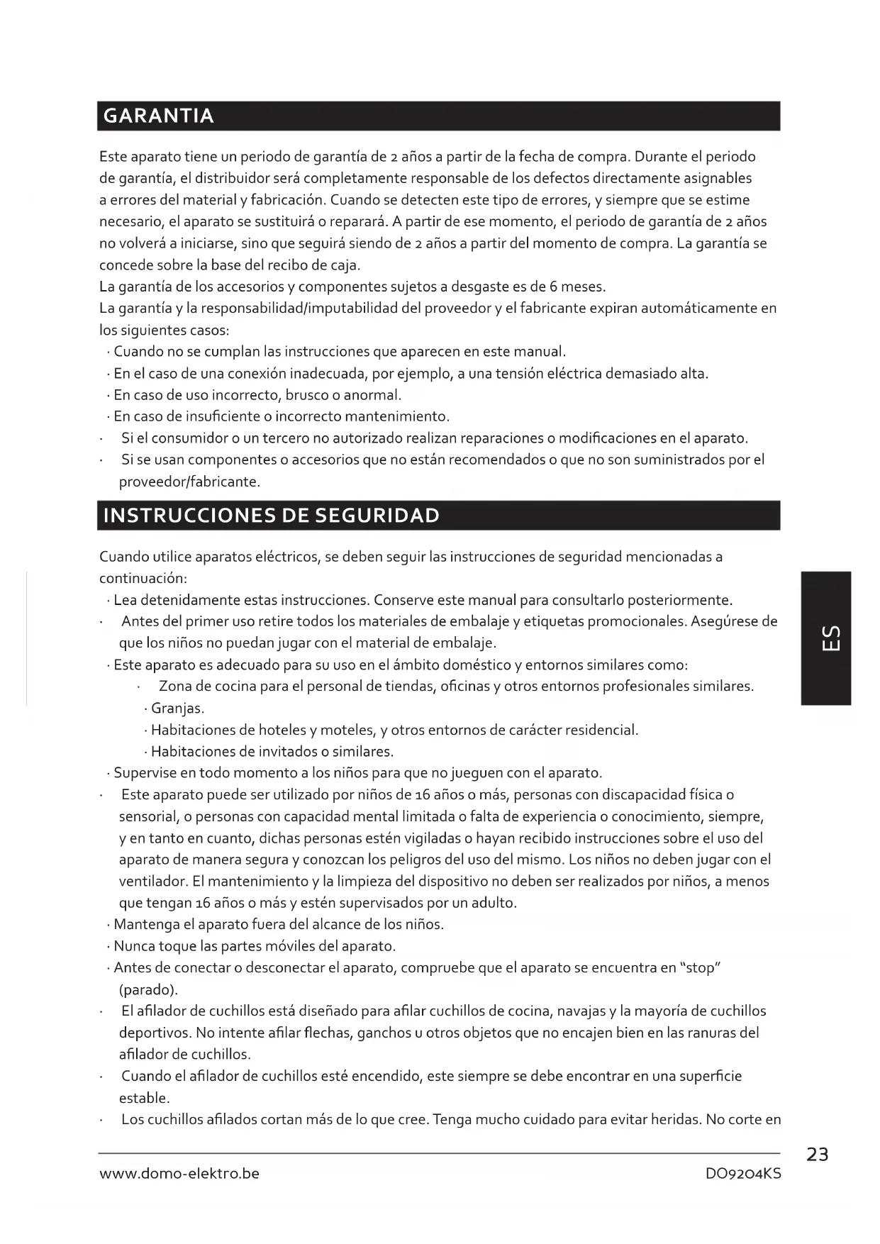 - Las partículas de metal, que se han liberado durante el alado, ahora habrán desaparecido. PREGUNTAS FRECUENTES HE SEGUIDO TODAS LAS INSTRUCCIONES PERO, SIN EMBARGO, MIS CUCHILLOS NO ESTÁN AFILADOS. Cuando los cuchillos no se han alado durante mucho tiempo, o cuando estos no se han alado correctamente, es posible que tenga que volver a repetir todos los pasos anteriores. Los cuchillos de acero endurecido requieren más tiempo para alarse. En ese caso, debe repetir todos los pasos anteriores hasta que el cuchillo esté alado. Le recomendamos que ale sus cuchillos regularmente para que siempre estén listos para usarlos. EL APARATO SE PARA DE VEZ EN CUANDO Este es un mecanismo de seguridad. Ejerce demasiada presión sobre la piedra de alar. Una ligera presión hacia abajo es suciente para que el cuchillo entre en contacto con la piedra de alar. Si ejerce demasiada presión, no obtendrá un resultado uniforme. ¿CÓMO CONSEGUIR UN BUEN RESULTADO? Deje reposar el cuchillo en la ranura. De esta manera, el cuchillo se posicionará oblicuamente contra la piedra. Si trabaja de esta manera para ambos lados, obtendrá un buen resultado. A VECES VEO CHISPAS QUE SALTAN DE LA PIEDRA DE AFILAR. Esto sucederá más rápido con cuchillos con un alto contenido de carbono (generalmente cuchillos de mayor calidad) que con cuchillos más baratos. Es un fenómeno completamente normal. ¿PUEDO USAR ESTE APARATO PARA CUCHILLOS CON HOJA DENTADA? Sí, es posible, excepto para cuchillos eléctricos o cuchillos dentados por ambos lados. Para los cuchillos con el lo dentado, use solo el lado derecho del aparato. Le recomendamos que solo ale el lado liso26 DO9204KS