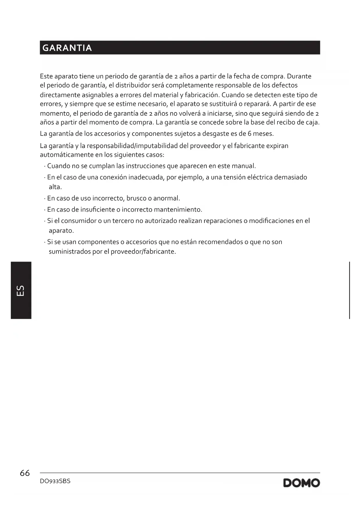 - Si se usan componentes o accesorios que no están recomendados o que no son suministrados por el proveedor/fabricante.67 DO933SBS www.domo-elektro.be