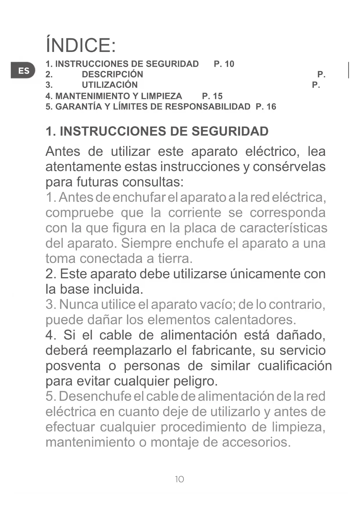 1. INSTRUCCIONES DE SEGURIDAD P. 10