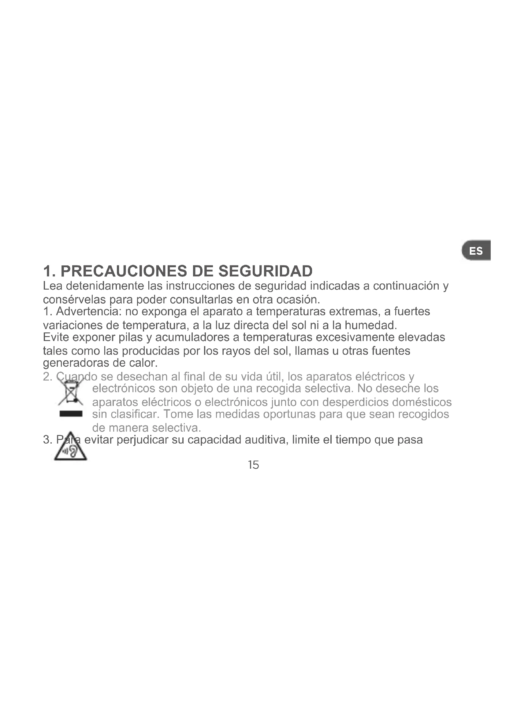 escuchando con los auriculares a un volumen elevado, ajuste el volumen a un nivel medio. Cuanto más elevado es el volumen, más debe usted disminuir el tiempo de escucha. 4.Respete los siguientes consejos durante el uso de los auriculares: -Escuche la música a un volumen adecuado y durante un periodo de tiempo razonable. -Durante el tiempo de escucha, ajuste el volumen progresivamente a un nivel que no sea demasiado alto. -No aumente el volumen a un nivel que no le permita escuchar el ruido circundante. -Tome precauciones o pare temporalmente de usar los auriculares en situaciones que puedan ser peligrosas. -No se aconseja utilizar los auriculares en las dos orejas cuando conduce. Eso puede ser ilegal en algunos países.ES