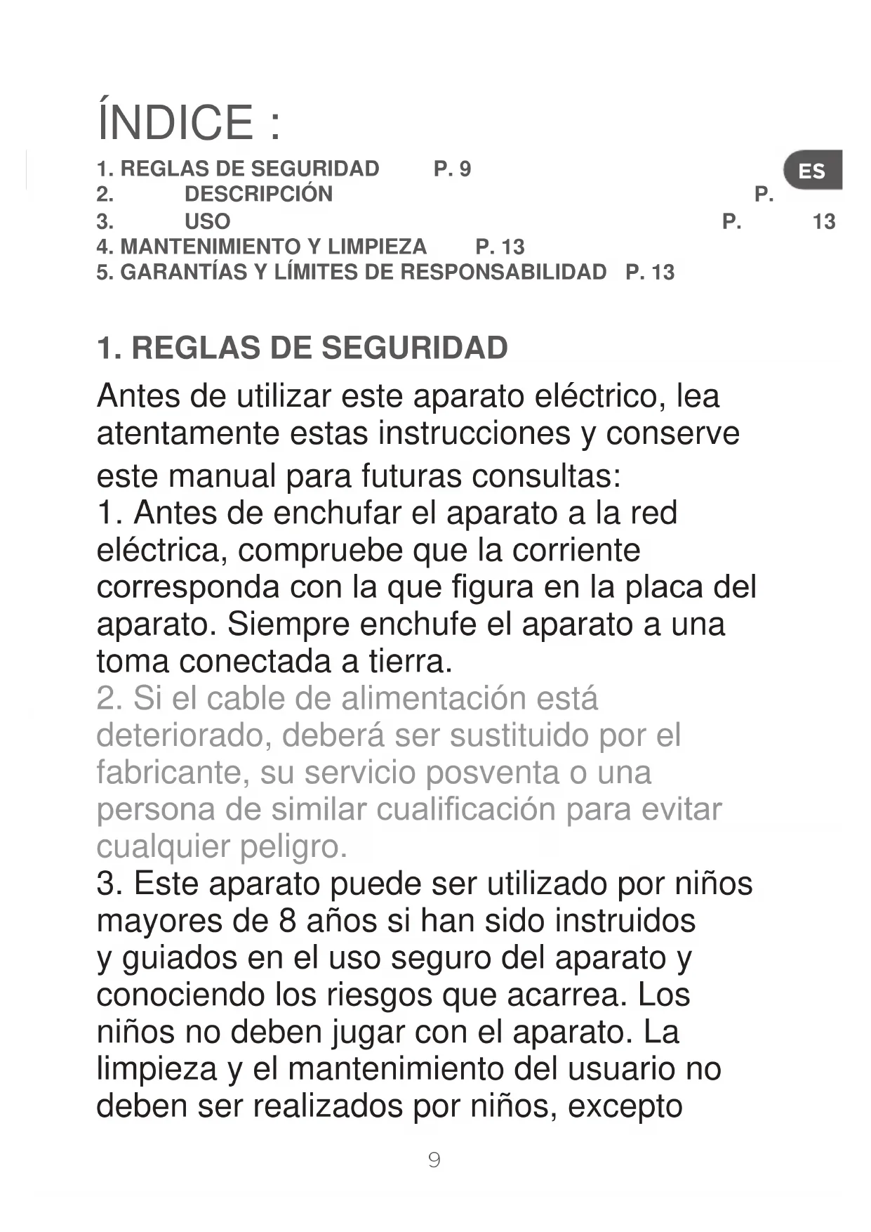 mayores de 8 años si han sido instruidos y guiados en el uso seguro del aparato y conociendo los riesgos que acarrea. Los niños no deben jugar con el aparato. La limpieza y el mantenimiento del usuario no deben ser realizados por niños, excepto ÍNDICE :