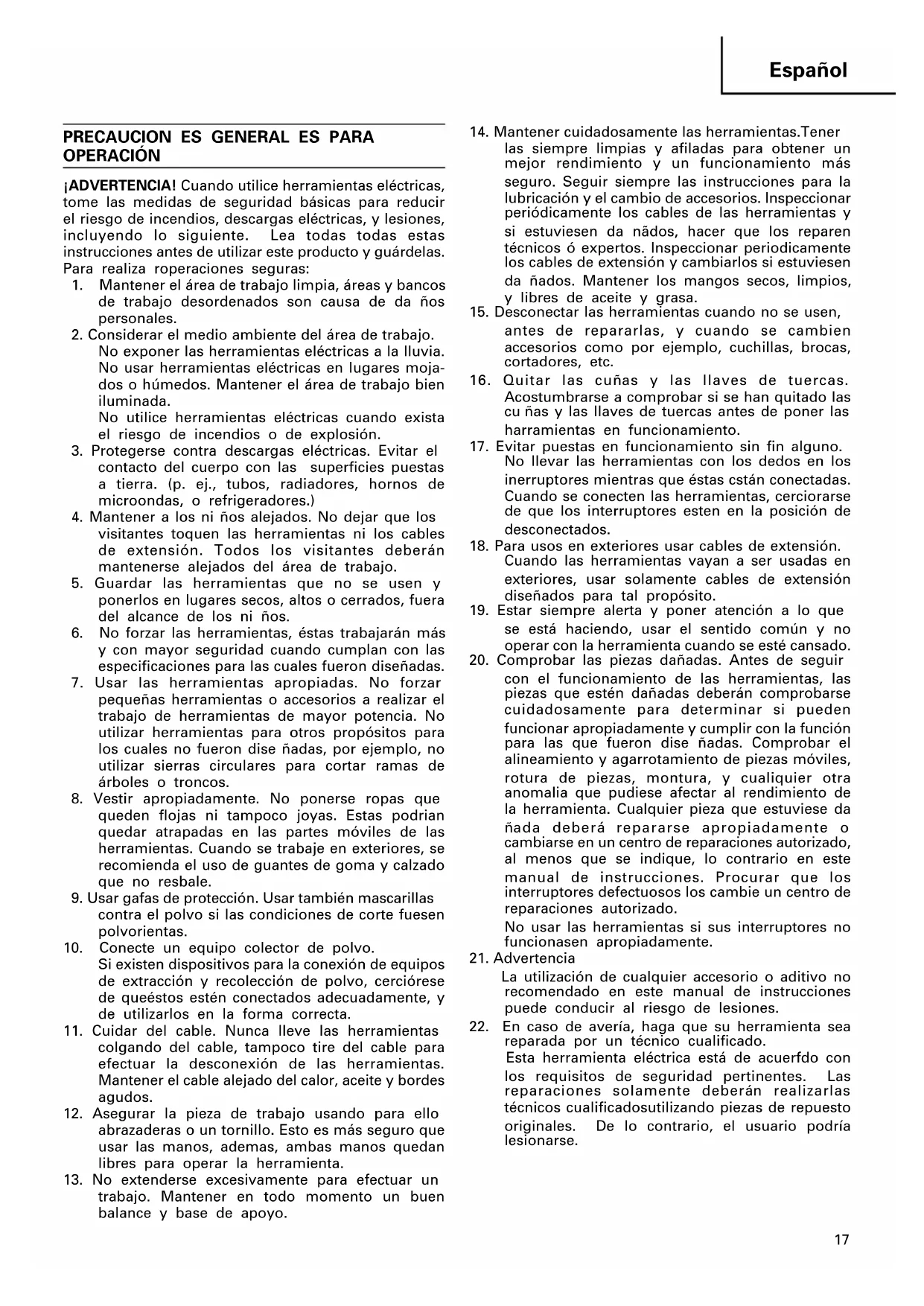 OPERACIÓN ¡ADVERTENCIA! Cuando utilice herramientas eléctricas, tome las medidas de seguridad básicas para reducir el riesgo de incendios, descargas eléctricas, y lesiones, incluyendo lo siguiente. Lea todas todas estas instrucciones antes de utilizar este producto y guárdelas. Para realiza roperaciones seguras: