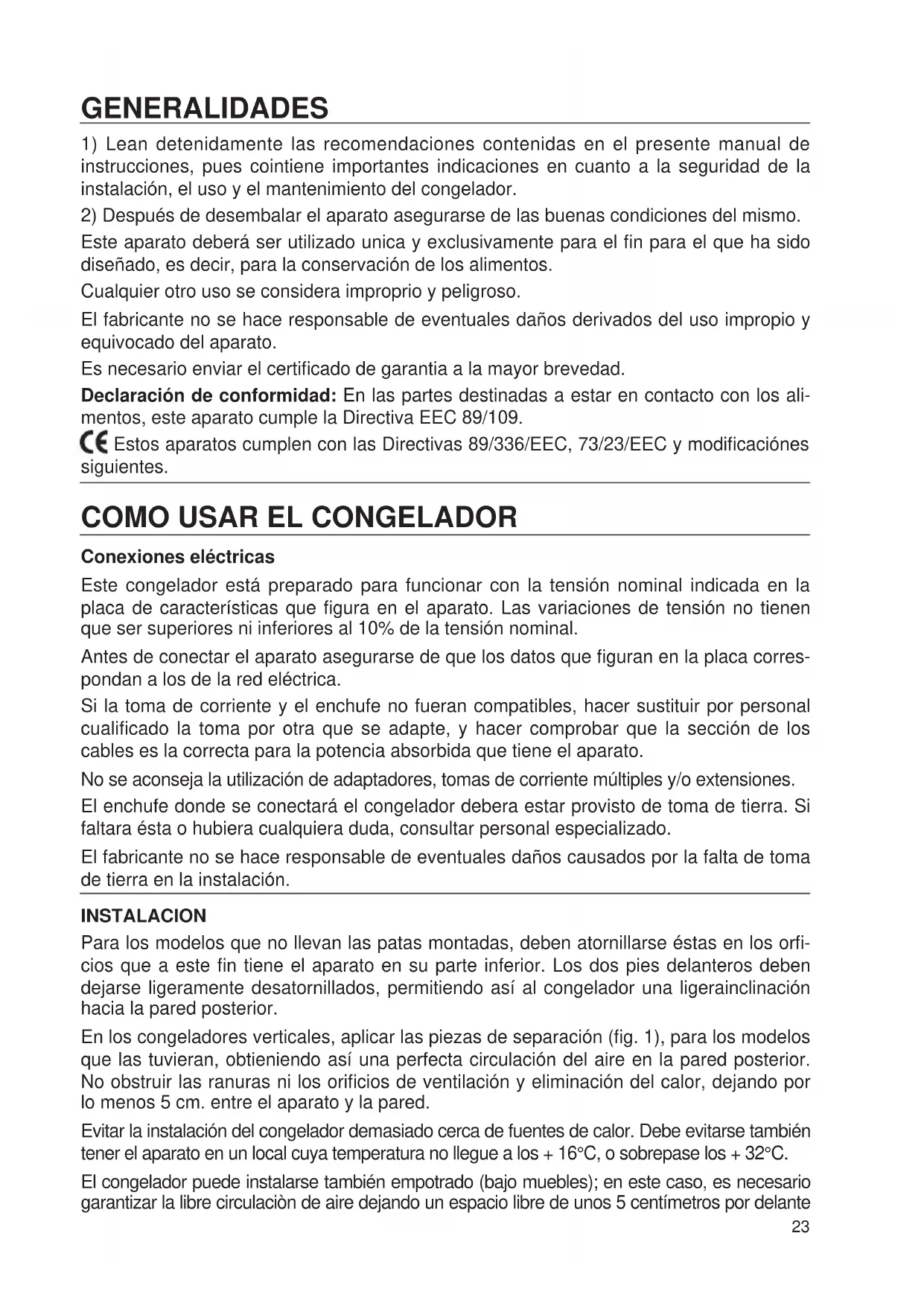 Conexiones eléctricas Este congelador está preparado para funcionar con la tensión nominal indicada en la placa de características que figura en el aparato. Las variaciones de tensión no tienen que ser superiores ni inferiores al 10% de la tensión nominal. Antes de conectar el aparato asegurarse de que los datos que figuran en la placa corres- pondan a los de la red eléctrica. Si la toma de corriente y el enchufe no fueran compatibles, hacer sustituir por personal cualificado la toma por otra que se adapte, y hacer comprobar que la sección de los cables es la correcta para la potencia absorbida que tiene el aparato. No se aconseja la utilización de adaptadores, tomas de corriente múltiples y/o extensiones. El enchufe donde se conectará el congelador debera estar provisto de toma de tierra. Si faltara ésta o hubiera cualquiera duda, consultar personal especializado. El fabricante no se hace responsable de eventuales daños causados por la falta de toma de tierra en la instalación. INSTALACION Para los modelos que no llevan las patas montadas, deben atornillarse éstas en los orfi- cios que a este fin tiene el aparato en su parte inferior. Los dos pies delanteros deben dejarse ligeramente desatornillados, permitiendo así al congelador una ligerainclinación hacia la pared posterior. En los congeladores verticales, aplicar las piezas de separación (fig. 1), para los modelos que las tuvieran, obtieniendo así una perfecta circulación del aire en la pared posterior. No obstruir las ranuras ni los orificios de ventilación y eliminación del calor, dejando por lo menos 5 cm. entre el aparato y la pared. Evitar la instalación del congelador demasiado cerca de fuentes de calor. Debe evitarse también tener el aparato en un local cuya temperatura no llegue a los + 16°C, o sobrepase los + 32°C. El congelador puede instalarse también empotrado (bajo muebles); en este caso, es necesario garantizar la libre circulaciòn de aire dejando un espacio libre de unos 5 centímetros por delante 23o en la parte posterior del mueble. Una mala instalación podría causar daños a personas, animales u objetos, de los cuales el fabri- cante no podría hacerse responsable.
