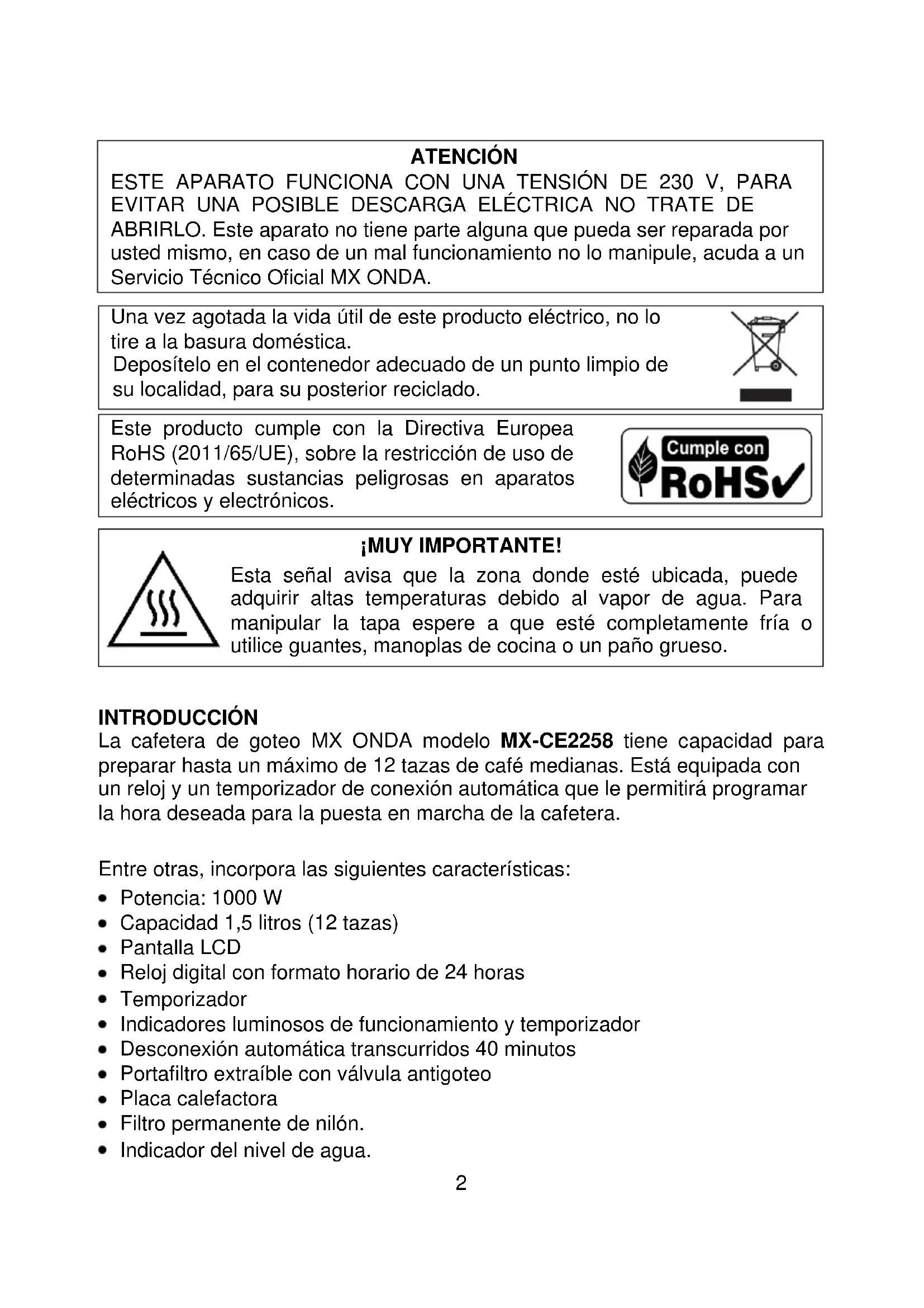 ATENCIÓN ESTE APARATO FUNCIONA CON UNA TENSIÓN DE 230 V, PARA EVITAR UNA POSIBLE DESCARGA ELÉCTRICA NO TRATE DE ABRIRLO. Este aparato no tiene parte alguna que pueda ser reparada por usted mismo, en caso de un mal funcionamiento no lo manipule, acuda a un Servicio Técnico Oficial MX ONDA. Una vez agotada la vida útil de este producto eléctrico, no lo tire a la basura doméstica. Deposítelo en el contenedor adecuado de un punto limpio de su localidad, para su posterior reciclado. Este producto cumple con la Directiva Europea RoHS (2011/65/UE), sobre la restricción de uso de determinadas sustancias peligrosas en aparatos eléctricos y electrónicos. ¡MUY IMPORTANTE! Esta señal avisa que la zona donde esté ubicada, puede adquirir altas temperaturas debido al vapor de agua. Para manipular la tapa espere a que esté completamente fría o utilice guantes, manoplas de cocina o un paño grueso.