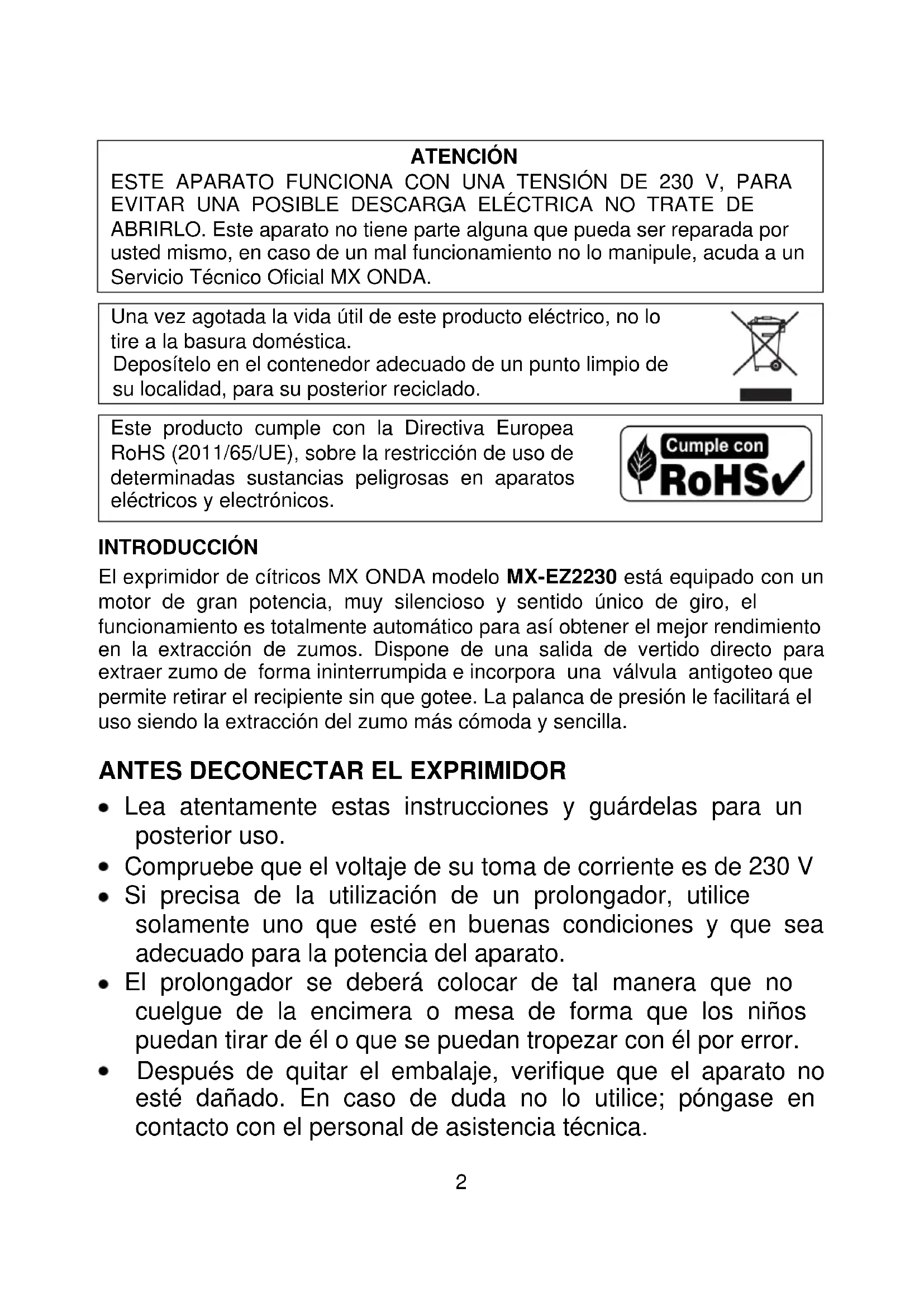 ATENCIÓN ESTE APARATO FUNCIONA CON UNA TENSIÓN DE 230 V, PARA EVITAR UNA POSIBLE DESCARGA ELÉCTRICA NO TRATE DE ABRIRLO. Este aparato no tiene parte alguna que pueda ser reparada por usted mismo, en caso de un mal funcionamiento no lo manipule, acuda a un Servicio Técnico Oficial MX ONDA. Una vez agotada la vida útil de este producto eléctrico, no lo tire a la basura doméstica. Deposítelo en el contenedor adecuado de un punto limpio de su localidad, para su posterior reciclado. Este producto cumple con la Directiva Europea RoHS (2011/65/UE), sobre la restricción de uso de determinadas sustancias peligrosas en aparatos eléctricos y electrónicos.