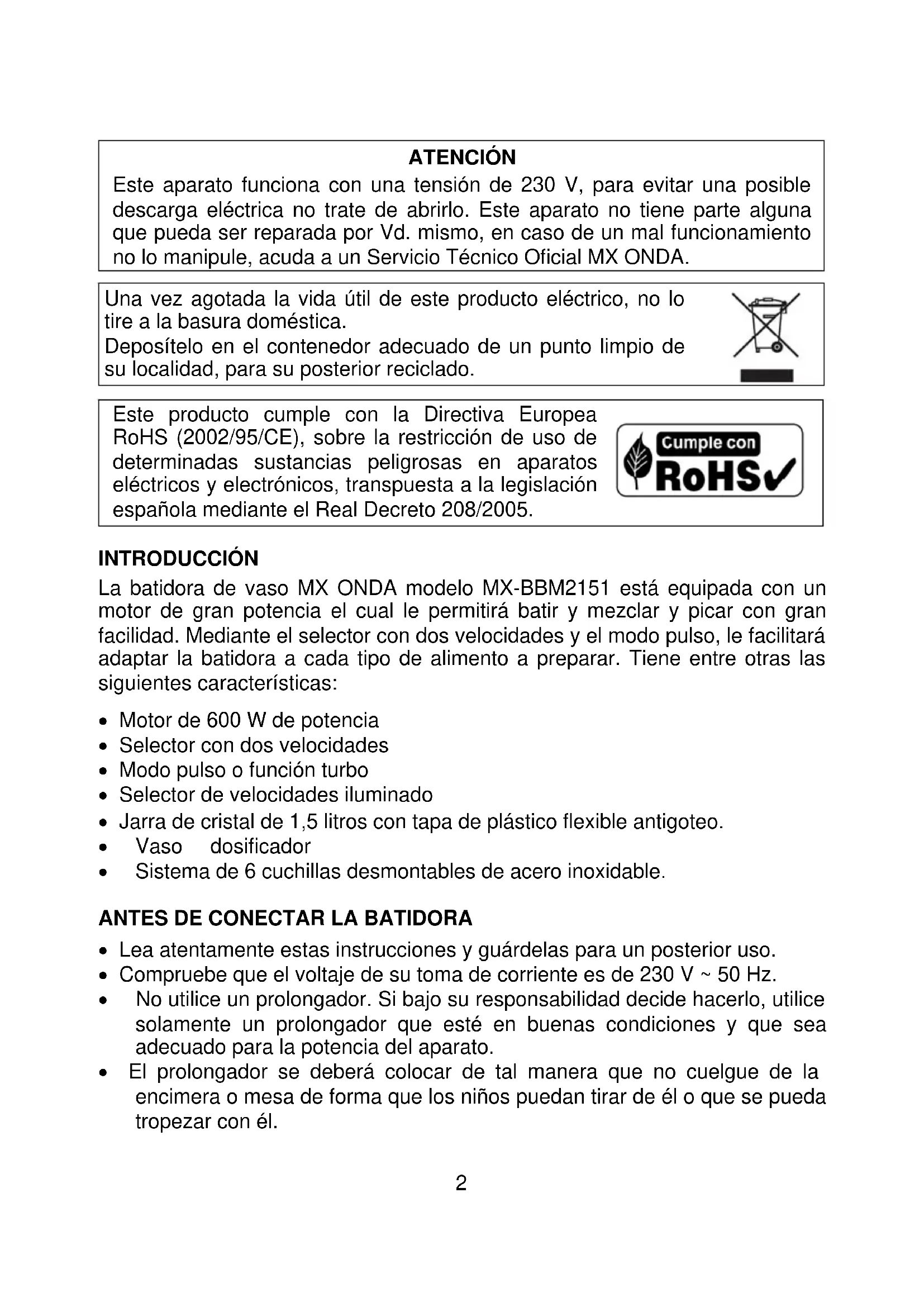 Este producto cumple con la Directiva Europea RoHS (2002/95/CE), sobre la restricción de uso de determinadas sustancias peligrosas en aparatos eléctricos y electrónicos, transpuesta a la legislación española mediante el Real Decreto 208/2005. INTRODUCCIÓN La batidora de vaso MX ONDA modelo MX-BBM2151 está equipada con un motor de gran potencia el cual le permitirá batir y mezclar y picar con gran facilidad. Mediante el selector con dos velocidades y el modo pulso, le facilitará adaptar la batidora a cada tipo de alimento a preparar. Tiene entre otras las siguientes características: