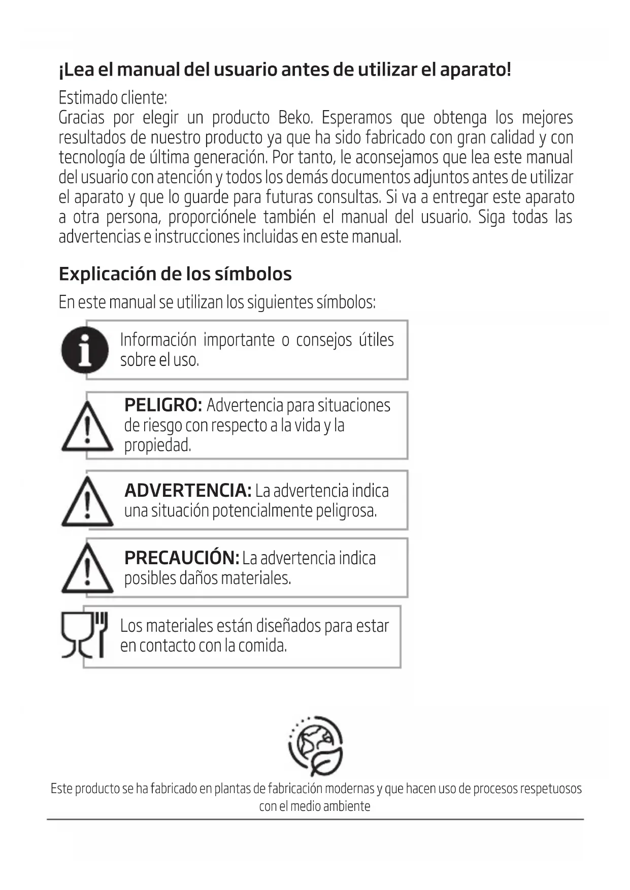 La cafetera completamente automátca Beko está dseñada para su uso en el hogar y aplcacones smlares, por ejemplo en cocnas de personal, tendas, ofcnas y áreas smlares o por clentes en habtacones de huéspedes, hoteles, moteles y otros alojamentos. Esta máquna de café no está dseñada para uso comercal. La máquna sólo está dseñada para preparar café y calentar leche y agua. Cualquer otro uso dstnto del ndcado anterormente se consdera como uso ndebdo.1 Instrucciones importantes para la seguridad y el medio ambiente 127 / ES Cafetera completamente automática / Manual de usuario ¡Peligro por uso inadecuado! Si no se utiliza para el uso previsto o se usa de cualquier otra manera, la cafetera puede ser o convertirse en una fuente de peligro.