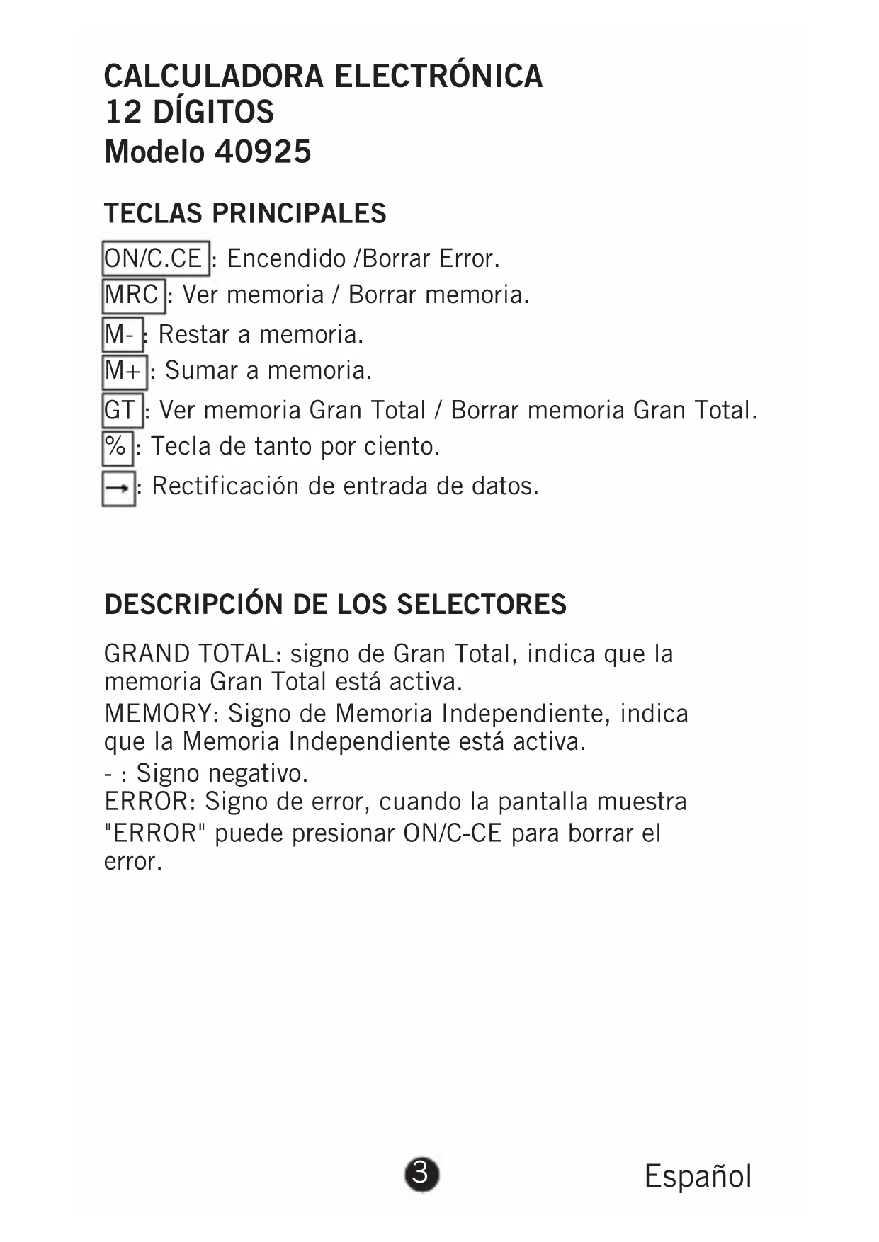 12 DÍGITOS Modelo 40925 TECLAS PRINCIPALES ON/C.CE : Encendido /Borrar Error. MRC : Ver memoria / Borrar memoria. M- : Restar a memoria. M+ : Sumar a memoria. GT : Ver memoria Gran Total / Borrar memoria Gran Total. % : Tecla de tanto por ciento. : Rectificación de entrada de datos.