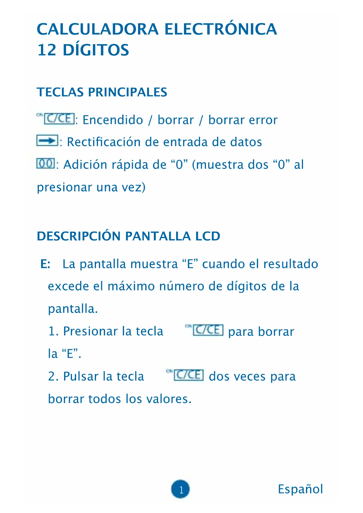 12 DÍGITOS TECLAS PRINCIPALES : Encendido / borrar / borrar error : Recticación de entrada de datos : Adición rápida de “0” (muestra dos “0” al presionar una vez)