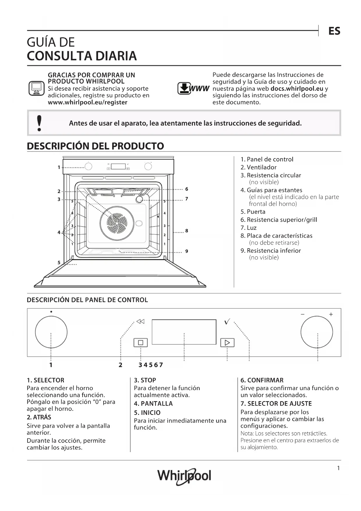 CONSULTA DIARIA GRACIAS POR COMPRAR UN PRODUCTO WHIRLPOOLSi desea recibir asistencia y soporte adicionales, registre su producto en www . whirlpool . eu / register WWW Puede descargarse las Instrucciones de seguridad y la Guía de uso y cuidado en nuestra página web docs.whirlpool.eu y siguiendo las instrucciones del dorso de este documento. Antes de usar el aparato, lea atentamente las instrucciones de seguridad.