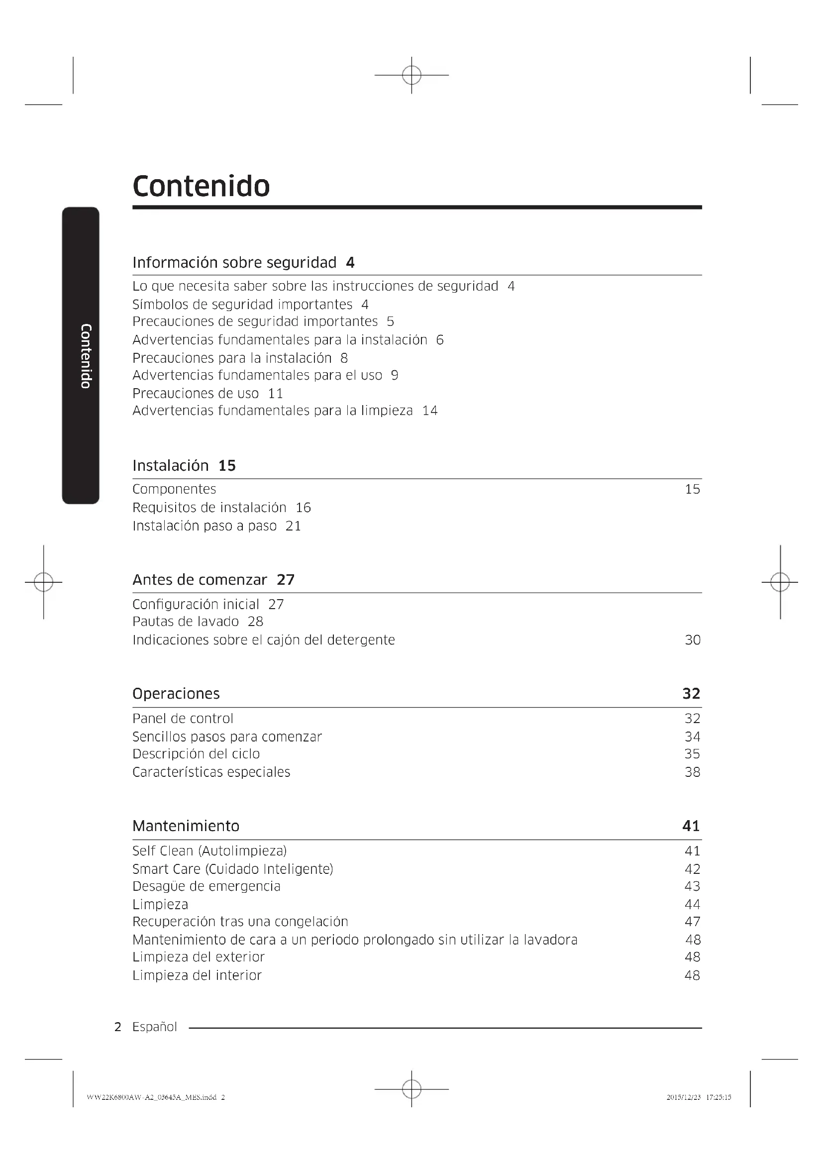 Contenido Información sobre seguridad 4 Lo que necesita saber sobre las instrucciones de seguridad 4 Símbolos de seguridad importantes 4 Precauciones de seguridad importantes 5 Advertencias fundamentales para la instalación 6 Precauciones para la instalación 8 Advertencias fundamentales para el uso 9 Precauciones de uso 11 Advertencias fundamentales para la limpieza 14 Instalación 15 Componentes 15 Requisitos de instalación 16 Instalación paso a paso 21 Antes de comenzar 27 Conguración inicial 27 Pautas de lavado 28 Indicaciones sobre el cajón del detergente 30 Operaciones 32 Panel de control 32 Sencillos pasos para comenzar 34 Descripción del ciclo 35 Características especiales 38 Mantenimiento 41 Self Clean (Autolimpieza) 41 Smart Care (Cuidado Inteligente) 42 Desagüe de emergencia 43 Limpieza 44 Recuperación tras una congelación 47 Mantenimiento de cara a un periodo prolongado sin utilizar la lavadora 48 Limpieza del exterior 48 Limpieza del interior 48 WW22K6800AW-A2_03645A_MES.indd 2 2015/12/23 17:25:15Contenido Español