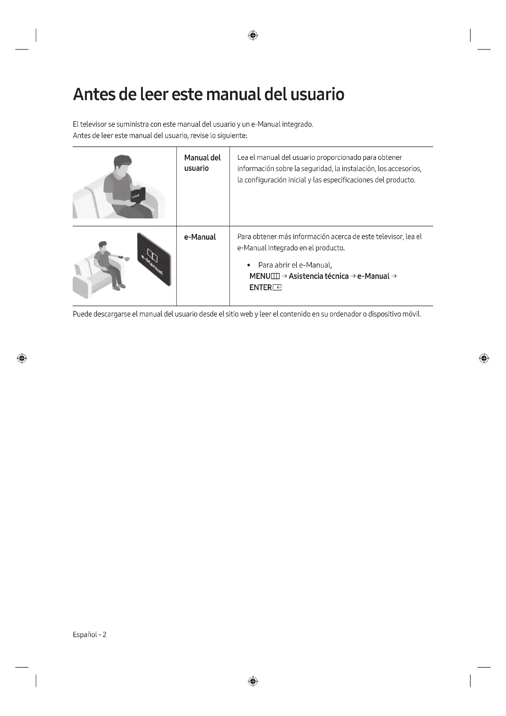 - Es posible que el equipo no funcione correctamente si se selecciona un formato de vídeo que no sea estándar. Español - 28 Español - 29 EspañolLicencias For DTS patents, see http://patents.dts.com. Manufactured under license from DTS, Inc. DTS, the Symbol, DTS in combination with the Symbol, DTS Premium Sound|5.1, DTS Digital Surround, DTS Express, and DTS Neo2:5 are registered trademarks or trademarks of DTS, Inc. in the United States and/or other countries. © DTS, Inc. All Rights Reserved. This DivX Certied® device can play DivX® HD video les (including .avi, .divx). Download free software at www.divx.com to create, play and stream digital videos. To play purchased DivX movies, rst register your device at vod.divx.com. Find your registration code in the DivX VOD section of your device setup menu. This DivX Certied® device can play DivX® HD video (including .avi, .divx). DivX®, DivX Certied® and associated logos are trademarks of DivX, LLC and are used under license. Covered by one or more of the following U.S. patents: 7,295,673; 7,460,668; 7,515,710; 8,656,183; 8,731,369; RE45,052. The terms HDMI and HDMI High-Denition Multimedia Interface, and the HDMI Logo are trademarks or registered trademarks of HDMI Licensing LLC in the United States and other countries. Manufactured under license from Dolby Laboratories. Dolby, Dolby Audio, Pro Logic, and the double-D symbol are trademarksof Dolby Laboratories. ESTE PRODUCTO SE VENDE CON UNA LICENCIA LIMITADA Y ESTÁ AUTORIZADO PARA UTILIZARSE SOLO EN RELACIÓN CON CONTENIDO HEVC QUE CUMPLA CON LOS TRES REQUISITOS SIGUIENTES: (1) CONTENIDO HEVC SOLO PARA USO PERSONAL; (2) CONTENIDO HEVC QUE NO ESTÉ PUESTO A LA VENTA; Y (3) CONTENIDO HEVC QUE SEA CREADO POR EL PROPIETARIO DEL PRODUCTO. ESTE PRODUCTO NO PODRÁ UTILIZARSE EN RELACIÓN CON CONTENIDO HEVC CODIFICADO CREADO POR UN TERCERO, QUE EL USUARIO HAYA PEDIDO O ADQUIRIDO DE UN TERCERO, A MENOS QUE UN VENDEDOR QUE TENGA LICENCIA SOBRE EL CONTENIDO HAYA OTORGADO POR SEPARADO AL USUARIO DERECHOS PARA USAR DEL PRODUCTO CON DICHO CONTENIDO. EL USO QUE USTED HAGA DE ESTE PRODUCTO EN RELACIÓN CON EL CONTENIDO HEVC CODIFICADO SE CONSIDERA COMO ACEPTACIÓN DE LA AUTORIZACIÓN LIMITADA DE USO COMO INDICADO ANTERIORMENTE. Open Source License Notice Open Source used in this product can be found on the following webpage. (http://opensource.samsung.com) Open Source License Notice is written only English. Español - 30 Español - 31Recomendación - Solo UE Por el presente documento Samsung Electronics declara que este televisor cumple con los requisitos esenciales y otras disposiciones relevantes de la Directiva 1999/5/CE. La Declaración de conformidad ocial se puede encontrar en http://www.samsung.com/es. Vaya a Atención al Cliente > Encontrar e introduzca el modelo. Este equipo solo se debe utilizar en interiores. Este equipo puede funcionar en todos los países de la UE. Correcta eliminación del producto (desechos de equipos eléctricos y electrónicos) (Aplicable en países con sistemas de recogida selectiva) Esta marca en el producto, los accesorios o la documentación indica que el producto y los accesorios electrónicos (como cargador, auriculares, cable USB) no se deben desechar junto al resto de la basura doméstica. Para prevenir posibles daños al entorno ambiental o a las personas por una eliminación incontrolada, cuando decida desprenderse del aparato debe acudir a un centro de reciclaje donde se promueva la reutilización sostenible de los recursos materiales. Los usuarios particulares pueden ponerse en contacto con el centro donde adquirieron el aparato o con alguna ocina municipal donde le informarán de dónde debe depositar el electrodoméstico para su reciclaje. Los comerciantes deben ponerse en contacto con el distribuidor y comprobar los términos y las condiciones del contrato de compra. Este producto y sus accesorios electrónicos no se deben mezclar con otros deshechos comerciales para su eliminación. Correcta eliminación de las pilas de este producto (Aplicable en países con sistemas de recogida selectiva) Esta marca en las pilas, el manual o el embalaje indica que las pilas de este producto no se deben desechar junto con los residuos domésticos al término de su vida útil. Cuando está indicado, los símbolos químicos Hg, Cd o Pb indican que las pilas contienen mercurio, cadmio o plomo que superan los niveles de referencia de la directiva CE 2006/66. Si las pilas no se eliminan adecuadamente, estas sustancias pueden causar daños a la salud humana y al medio ambiente. Para proteger los recursos naturales y promover la reutilización de los materiales, separe la pilas de otros tipos de basura doméstica y recíclelas en su sistema local de recogida gratuita de pilas. Para obtener información sobre los compromisos medioambientales y las obligaciones legales de algún producto especíco de Samsung, como por ejemplo REACH, WEEE o las pilas, visite http://www.samsung.com/uk/ aboutsamsung/samsungelectronics/corporatecitizenship/data_corner.html ADVERTENCIA - PARA IMPEDIR QUE EL FUEGO SE PROPAGUE, MANTENGA EN TODO MOMENTO LA LLAMA DE LAS VELAS O DE OTROS OBJETOS LEJOS DE ESTE PRODUCTO. Español - 30 Español - 31 EspañolPortuguês - 2 Português - 3 Antes de ler o manual do utilizador Este televisor vem acompanhado de manual do utilizador e de e-Manual incluído. Antes de ler este manual do utilizador, reveja o seguinte: Manual do utilizador Leia o presente manual do utilizador para obter informações sobre segurança do produto, instalação, acessórios, conguração inicial e especicações do produto. e-Manual Para obter mais informações sobre o televisor, leia o e-Manual incluído no produto.
