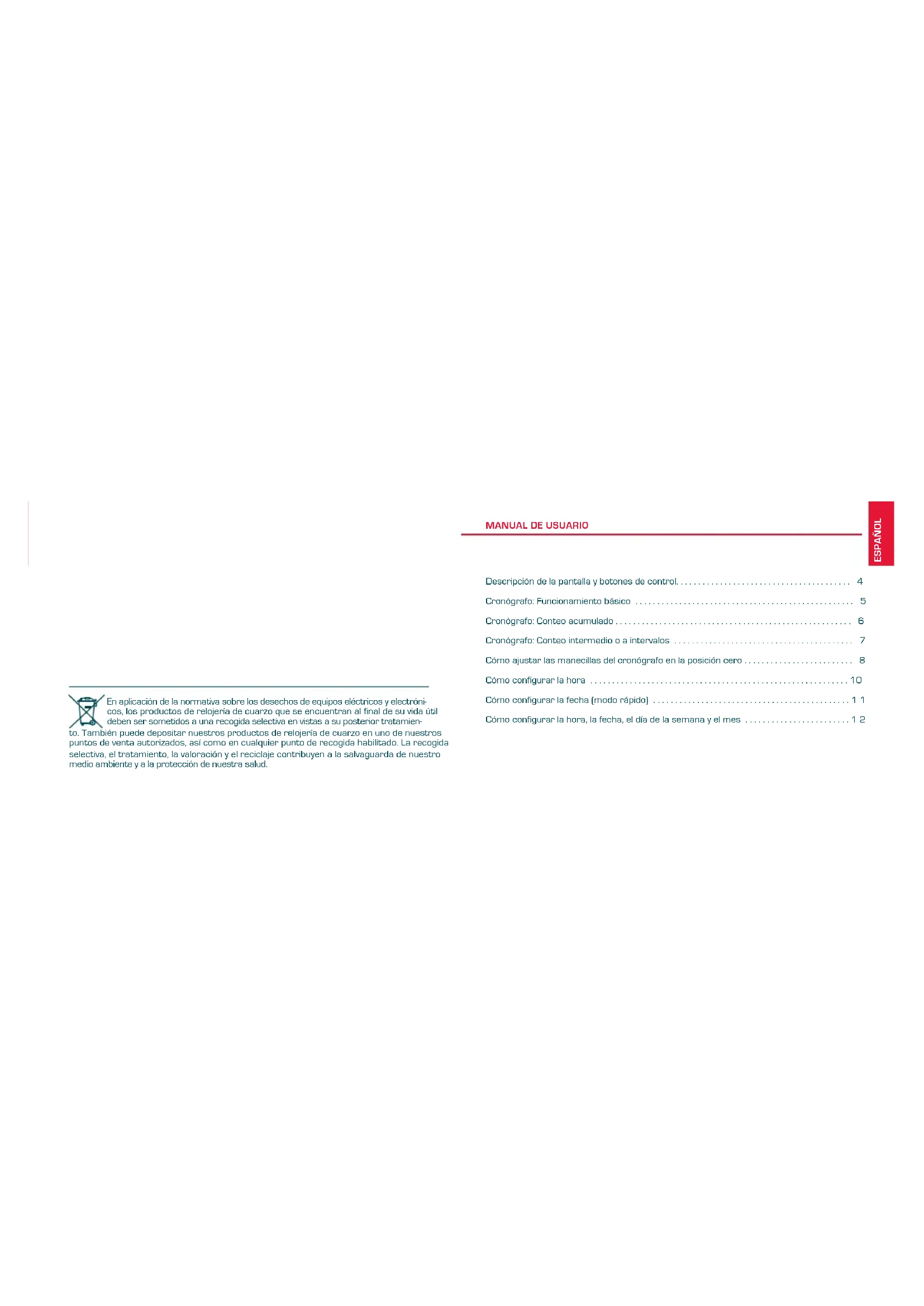 En aplicación de la normativa sobre los desechos de equipos eléctricos y electrónicos, los productos de relojenía de cuarzo que se encuentran al final de su vida útil deben ser sometidos a una recogida selectiva en vistas a su posterior tratamiento.