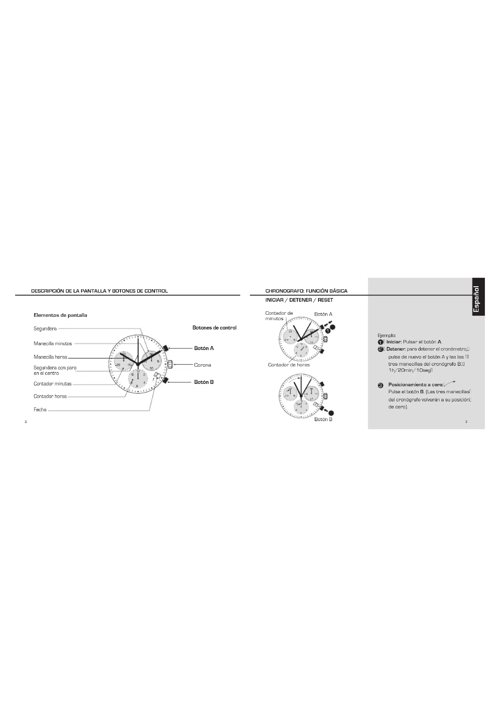 Una o diversas de las manecillas del cronógrafo no están en su posición cero correcta y deben ajustarse (p. ej. después de cambiar la pila). Tire de la corona hasta la posición III (las 3 manecillas del cronógrafo están en su posición cero correcta o incorrecta). Mantenga pulsados los botones A y B simultáneamente durante 2 segundos (la segundera con paro en el centro rota 360ª modo correctivo activado). Devolver la corona a la posición I. Finalización del ajuste de las manecillas del cronógrafo (puede efetuarse en cualquier momento). EspañolSegundera