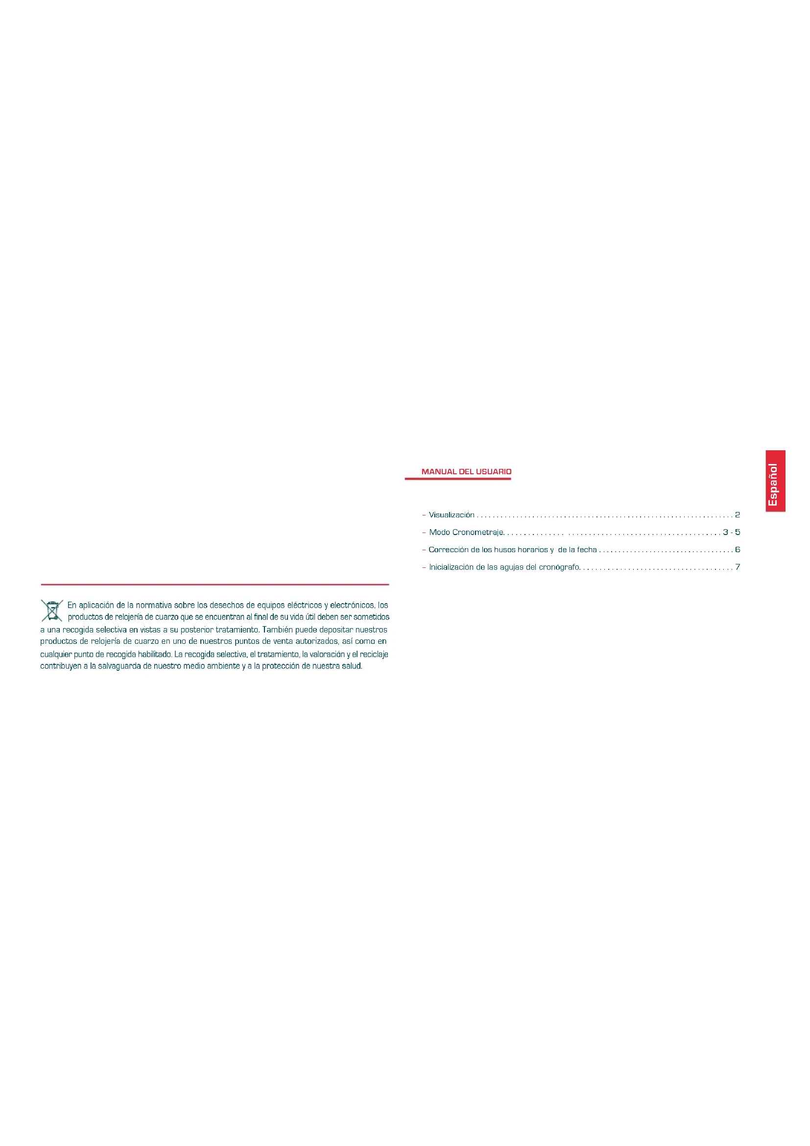 - – Inicialización de las agujas del cronógrafo Español En aplicación de la normativa sobre los desechos de equipos eléctricos y electrónicos, los productos de relojería de cuarzo que se encuentran al final de su vida útil deben ser sometidos a una recogida selectiva en vistas a su posterior tratamiento. También puede depositar nuestros productos de relojería de cuarzo en uno de nuestros puntos de venta autorizados, así como en cualquier punto de recogida habilitado. La recogida selectiva, el tratamiento, la valoración y el reciclaje contribuyen a la salvaguarda de nuestro medio ambiente y a la protección de nuestra salud.2 VISUALIZACIÓN Contador de 60 segundos Contador de 1/10 de segundo Contador de 30 minutos Aguja de los minutos Aguja de las horas Aguja de los segundos Indicador de la fecha Pulsador A: START STOP Pulsador B: split-time Puesta a cero Corona de puesta en hora p. 7