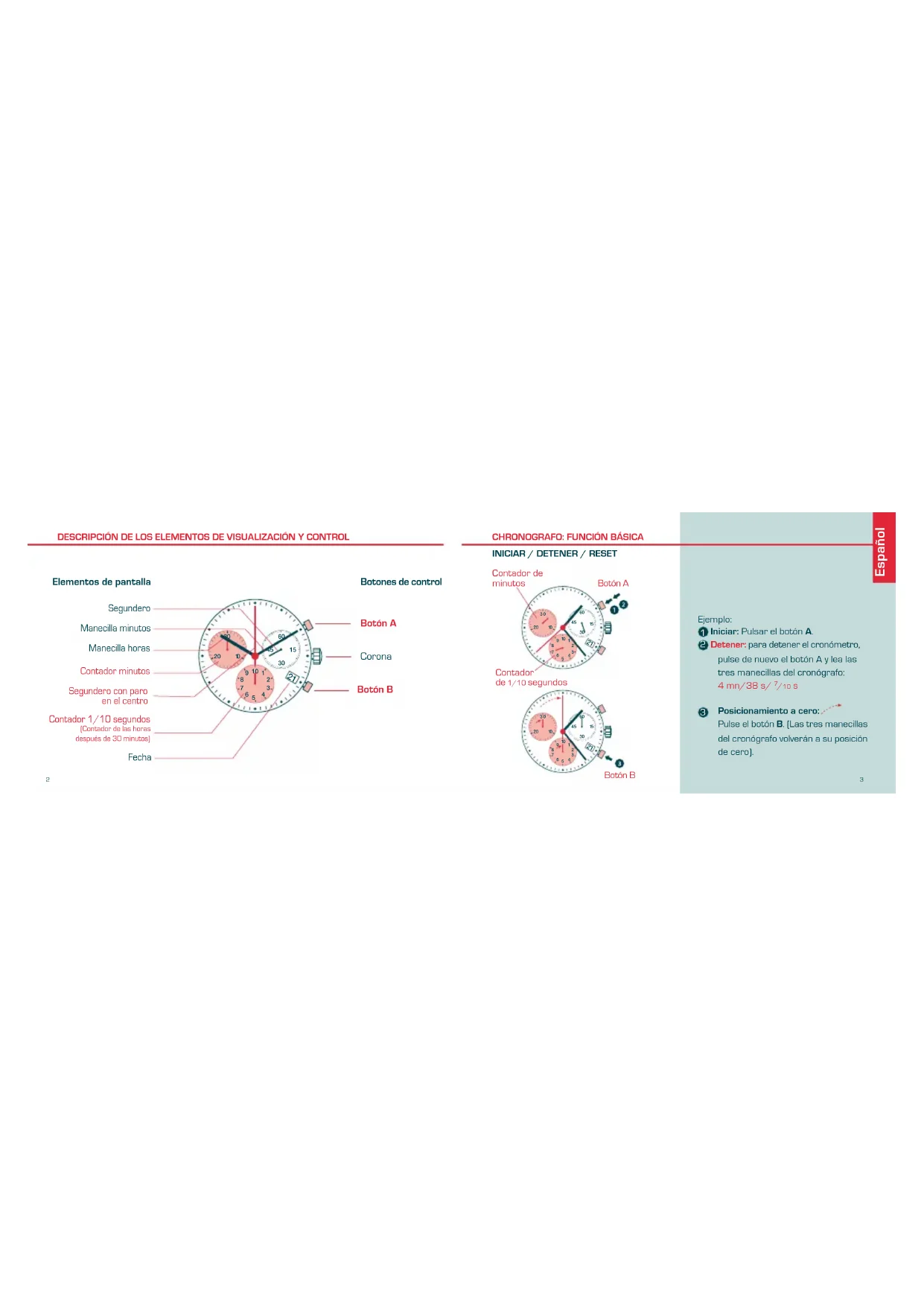 Una o diversas de las manecillas del cronógrafo no están en su posición cero correcta y deben ajustarse (p. ej. después de cambiar la pila). Tire de la corona hasta la posición III (las 3 manecillas del cronógrafo están en su posición cero correcta o incorrecta). Mantenga pulsados los botones A y B simultáneamente durante 2 segundos el segundero con paro en el centro rota 360ª modo correctivo activado). Devolver la corona a la posición I. Finalización del ajuste de las manecillas del cronógrafo (puede efetuarse en cualquier momento). Español