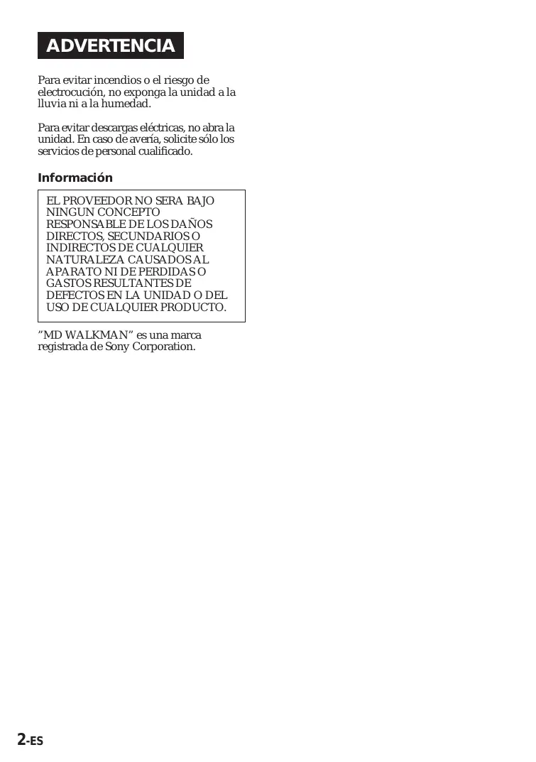 EL PROVEEDOR NO SERA BAJO NINGUN CONCEPTO RESPONSABLE DE LOS DAÑOS DIRECTOS, SECUNDARIOS O INDIRECTOS DE CUALQUIER NATURALEZA CAUSADOS AL APARATO NI DE PERDIDAS O GASTOS RESULTANTES DE DEFECTOS EN LA UNIDAD O DEL USO DE CUALQUIER PRODUCTO. ”MD WALKMAN” es una marca registrada de Sony Corporation.