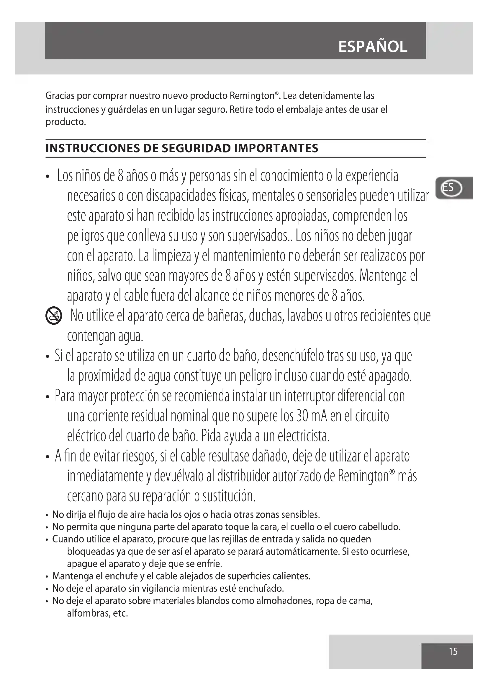 - Los niños de 8 años o más y personas sin el conocimiento o la experiencia necesarios o con discapacidades físicas, mentales o sensoriales pueden utilizar este aparato si han recibido las instrucciones apropiadas, comprenden los peligros que conlleva su uso y son supervisados.. Los niños no deben jugar con el aparato. La limpieza y el mantenimiento no deberán ser realizados por niños, salvo que sean mayores de 8 años y estén supervisados. Mantenga el aparato y el cable fuera del alcance de niños menores de 8 años. B No utilice el aparato cerca de bañeras, duchas, lavabos u otros recipientes que contengan agua.