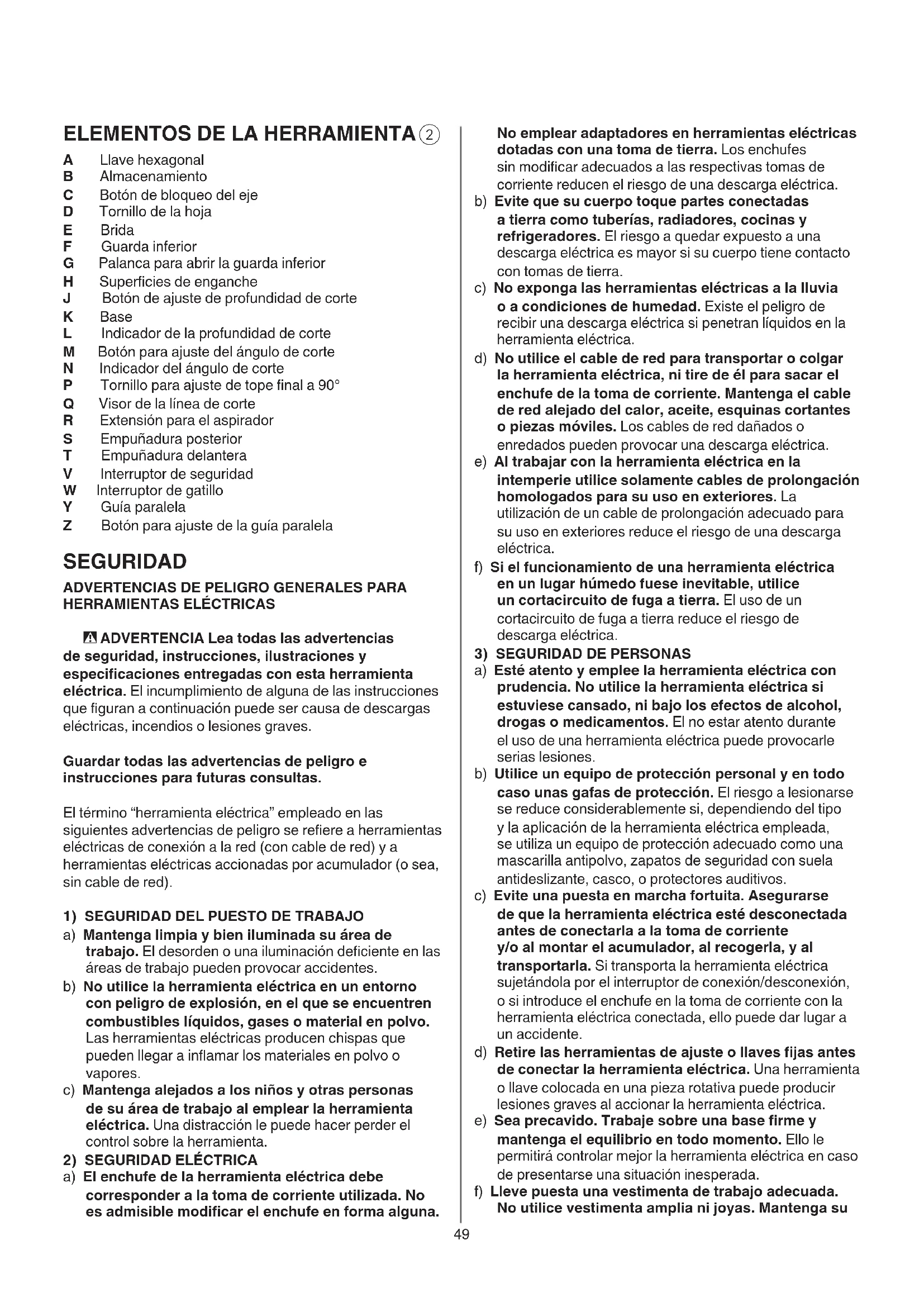 A Llave hexagonal B Almacenamiento C Botón de bloqueo del eje D Tornillo de la hoja E Brida F Guarda inferior G Palanca para abrir la guarda inferior H Supercies de enganche J Botón de ajuste de profundidad de corte K Base L Indicador de la profundidad de corte M Botón para ajuste del ángulo de corte N Indicador del ángulo de corte P Tornillo para ajuste de tope nal a 90° Q Visor de la línea de corte R Extensión para el aspirador S Empuñadura posterior T Empuñadura delantera V Interruptor de seguridad W Interruptor de gatillo Y Guía paralela Z Botón para ajuste de la guía paralela SEGURIDAD