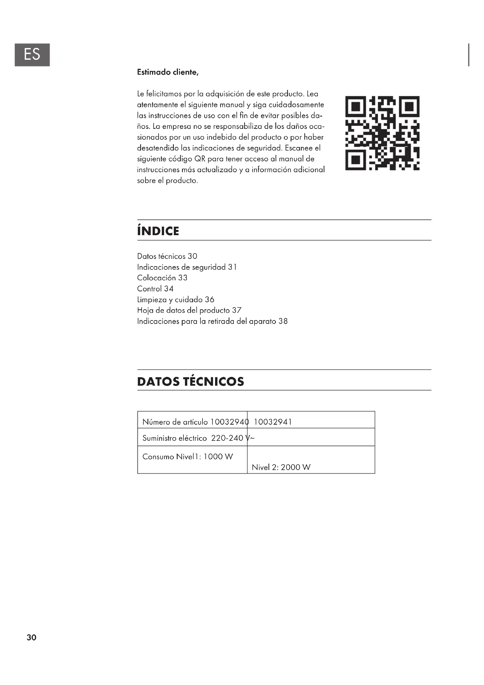 Datos técnicos 30 Indicaciones de seguridad 31 Colocación 33 Control 34 Limpieza y cuidado 36 Hoja de datos del producto 37 Indicaciones para la retirada del aparato 38 Estimado cliente, Le felicitamos por la adquisición de este producto. Lea atentamente el siguiente manual y siga cuidadosamente las instrucciones de uso con el n de evitar posibles da- ños. La empresa no se responsabiliza de los daños oca- sionados por un uso indebido del producto o por haber desatendido las indicaciones de seguridad. Escanee el siguiente código QR para tener acceso al manual de instrucciones más actualizado y a información adicional sobre el producto. ÍNDICE