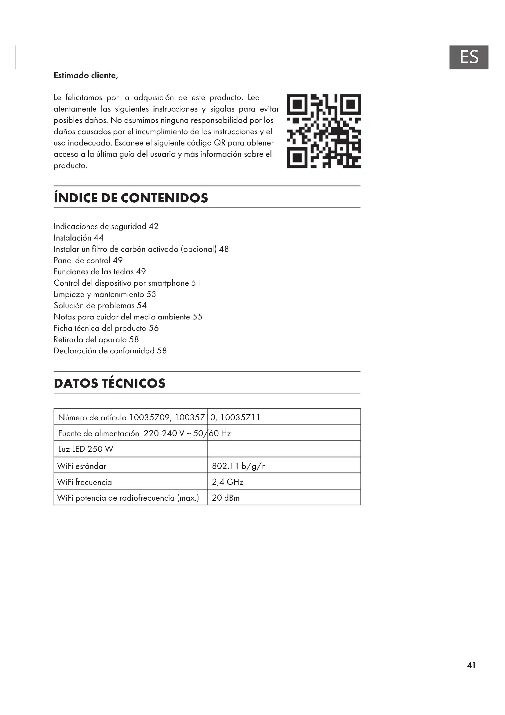 Indicaciones de seguridad42 Instalación44 Instalar un ltro de carbón activado (opcional)48 Panel de control49 Funciones de las teclas49 Control del dispositivo por smartphone51 Limpieza y mantenimiento53 Solución de problemas54 Notas para cuidar del medio ambiente55 Ficha técnica del producto56 Retirada del aparato58 Declaración de conformidad58