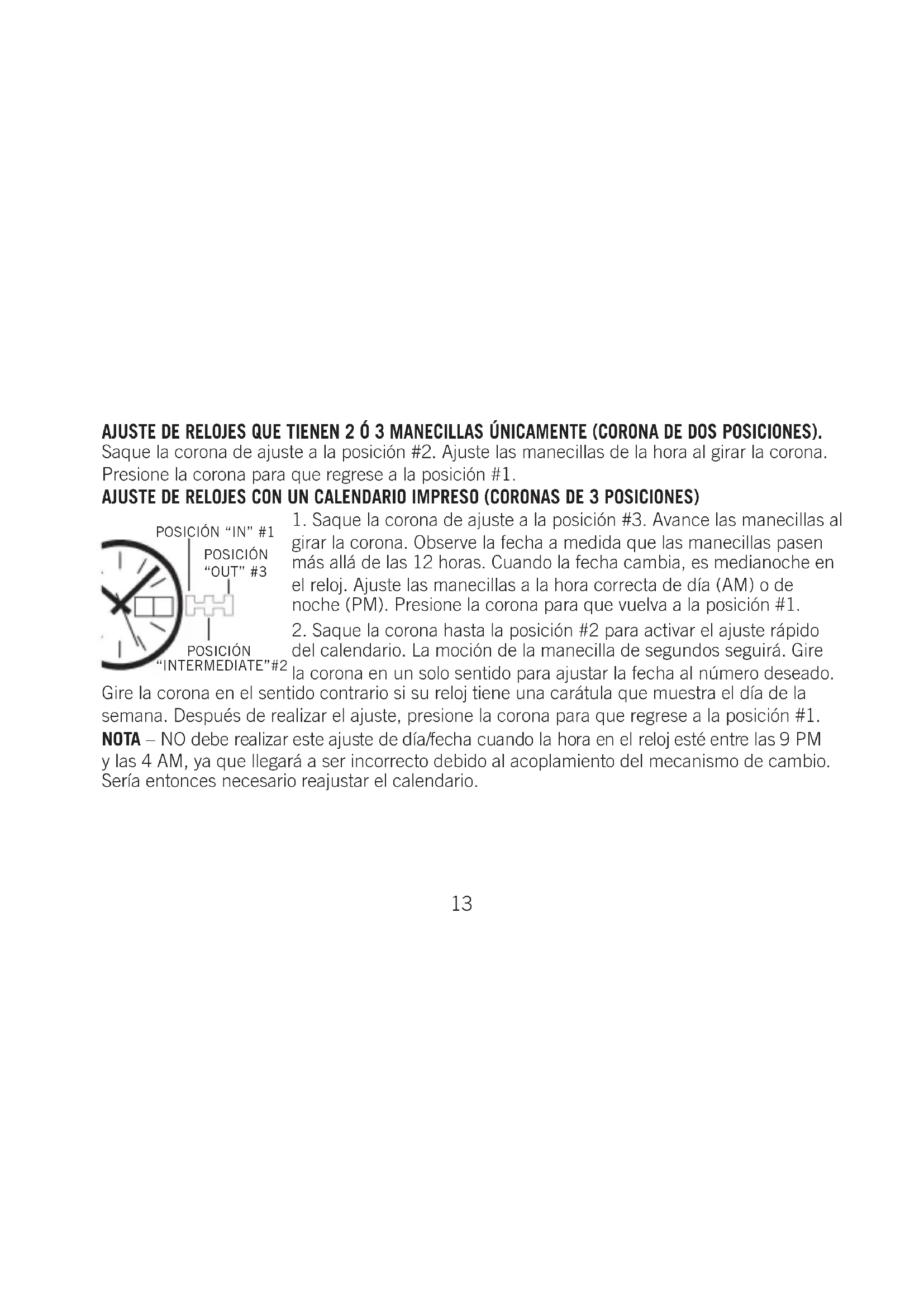 del calendario. La moción de la manecilla de segundos seguirá. Gire la corona en un solo sentido para ajustar la fecha al número deseado. Gire la corona en el sentido contrario si su reloj tiene una carátula que muestra el día de la semana. Después de realizar el ajuste, presione la corona para que regrese a la posición #1. NOTA – NO debe realizar este ajuste de día/fecha cuando la hora en el reloj esté entre las 9 PM y las 4 AM, ya que llegará a ser incorrecto debido al acoplamiento del mecanismo de cambio. Sería entonces necesario reajustar el calendario.