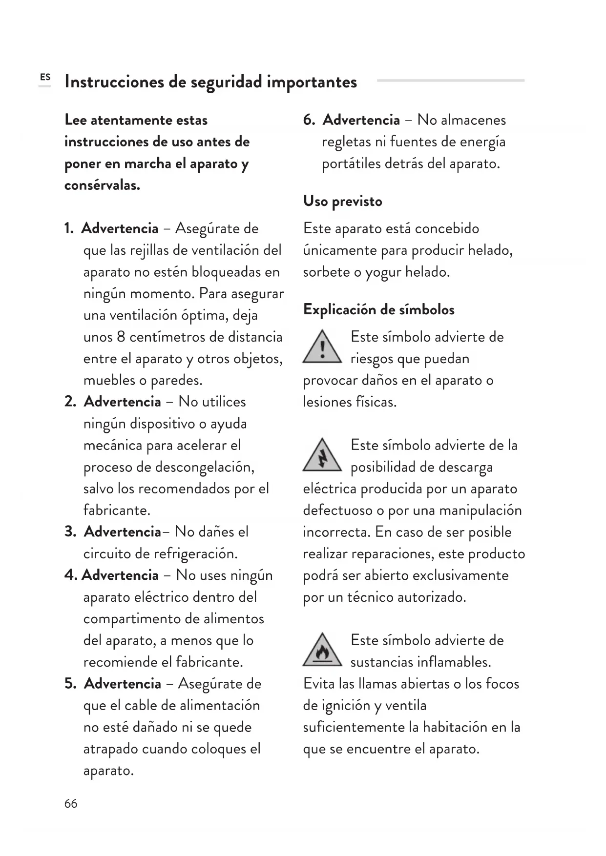regletas ni fuentes de energía portátiles detrás del aparato. Uso previsto Este aparato está concebido únicamente para producir helado, sorbete o yogur helado. Explicación de símbolos Este símbolo advierte de riesgos que puedan provocar daños en el aparato o lesiones físicas. Este símbolo advierte de la posibilidad de descarga eléctrica producida por un aparato defectuoso o por una manipulación incorrecta. En caso de ser posible realizar reparaciones, este producto podrá ser abierto exclusivamente por un técnico autorizado. Este símbolo advierte de sustancias inflamables. Evita las llamas abiertas o los focos de ignición y ventila suficientemente la habitación en la que se encuentre el aparato. ES67 Instrucciones de seguridad No almacenes en este aparato ningún tipo de sustancias explosivas como, por ejemplo, botes aerosoles con gases inflamables. No sumerjas nunca el aparato en agua u otros líquidos y protege el cable de alimentación, el enchufe y la fuente de alimentación de la humedad. No toques el aparato en marcha, existe riesgo de lesiones. Asegúrate de que el aparato nunca se incline más de 45°, ya que el compresor podría dañarse. Deja que el aparato repose al menos 2 horas después de desembalarlo en su ubicación definitiva. El líquido refrigerante que contiene el aparato debe descender primero, o de lo contrario el compresor podría sufrir daños. En caso de que se produzca un montaje erróneo, un uso incorrecto o indebido o tras reparaciones por parte de terceros no autorizados, el fabricante no asume ningún tipo de garantía. Advertencia: riesgo de incendio! El circuito de refrigeración contiene el refrigerante isobutano (R600a), un gas natural y respetuoso con el medioambiente que, no obstante, es inflamable. Asegúrate de que el circuito de refrigeración no se dañe durante el transporte o el montaje del aparato. El refrigerante (R600a) es inflamable. En caso de que se dañe el circuito de refrigeración: