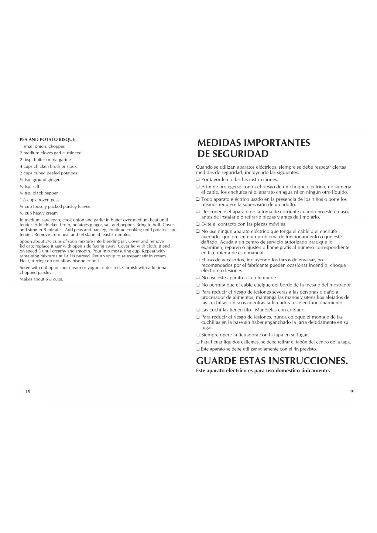 Pour mélanger des liquides chauds, retirer la pièce centrale du couvercle. ❑ N’utiliser cet appareil que pour les usages prévus. CONSERVERCESMESURES. L'appareilestconçupouruneutilisationdomestique seulement. CREMADEGUISANTESYPAPAS 1 cebolla pequeña, picada 2 ajos medianos, finamente picados 2 cdas mantequilla o margarina 4 tazas caldo o consomé de pollo 2 tazas papas peladas, partidas en cubitos ½ cdta jengibre molido ½ cdta sal ¼ cdta pimienta negra 1½ tazas guisantes congelados ¼ taza hojas de perejil, sin apretar ½ taza crema enriquecida En una cacerola mediana, cocine la cebolla y el ajo en la mantequilla sobre calor medio hasta que estén suaves. Agregue el caldo de pollo, las papas, el jengibre, la sal y la pimienta. Deje hervir. Cubra y hierva sobre fuego bajo durante 8 minutos. Agregue los guisantes y el perejil; continúe cociendo hasta que las papas estén suaves. Retire del fuego y deje reposar durante al menos 5 minutos. Vierta alrededor de 2½ tazas de sopa dentro de la jarra de la licuadora. Cubra con la tapa y quite el tapón; colóquelo entreabierto con el lado abierto alejado. Cubra la tapa con un paño. Mezcle usando la velocidad 3 hasta que esté suave y cremosa. Vierta en la taza de medir. Repita hasta que toda la sopa restante esté licuada. Regrese la sopa a la cacerola; incorpore la crema. Caliente y revuelva; no permita que la crema hierva. Sirva con una porción de crema agria o yogur, si desea. Aderece con perejil picado adicional. Rinde alrededor de 6½ tazas.33
