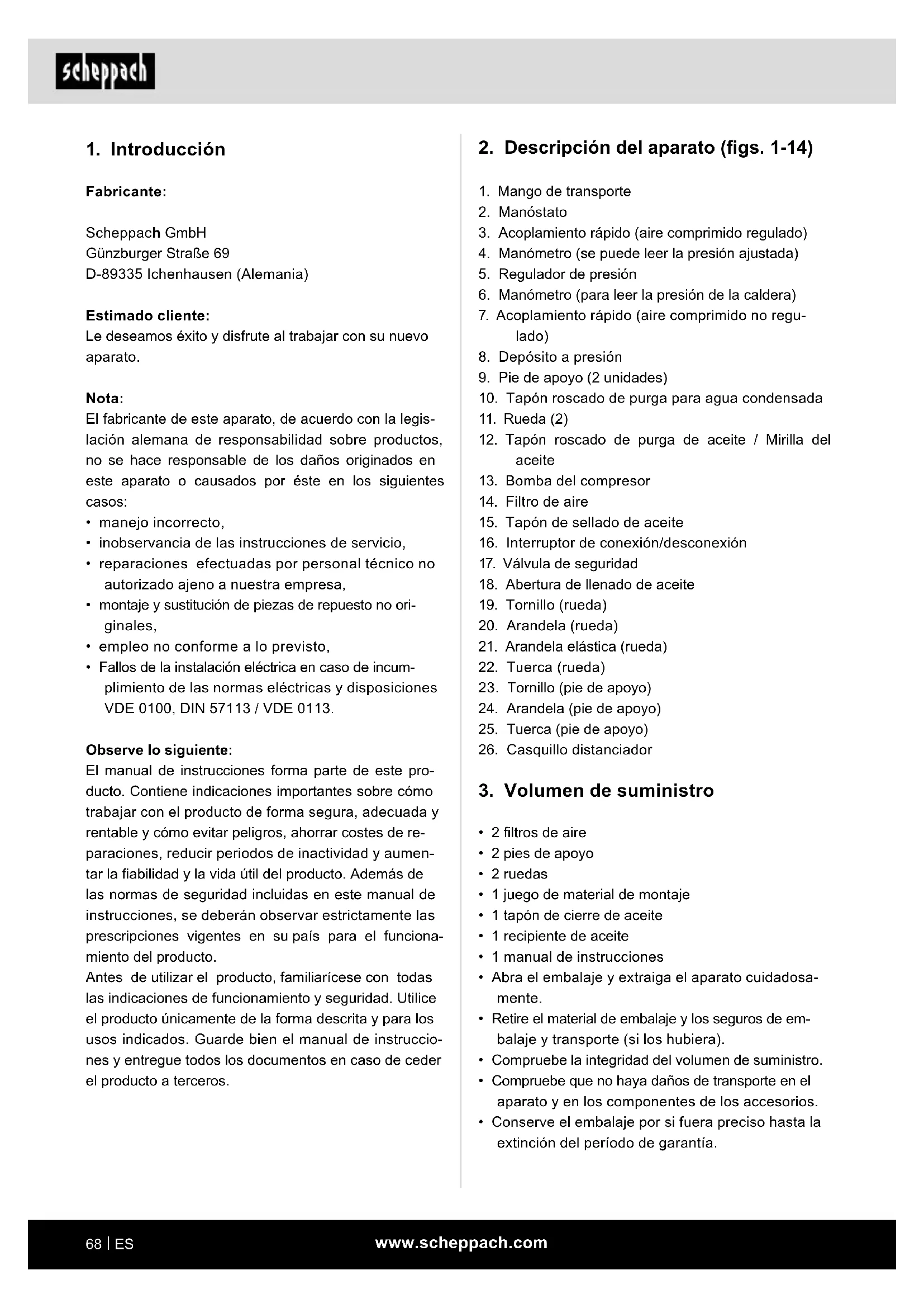 Fabricante: Scheppach GmbH Günzburger Straße 69 D-89335 Ichenhausen (Alemania) Estimado cliente: Le deseamos éxito y disfrute al trabajar con su nuevo aparato. Nota: El fabricante de este aparato, de acuerdo con la legis- lación alemana de responsabilidad sobre productos, no se hace responsable de los daños originados en este aparato o causados por éste en los siguientes casos: