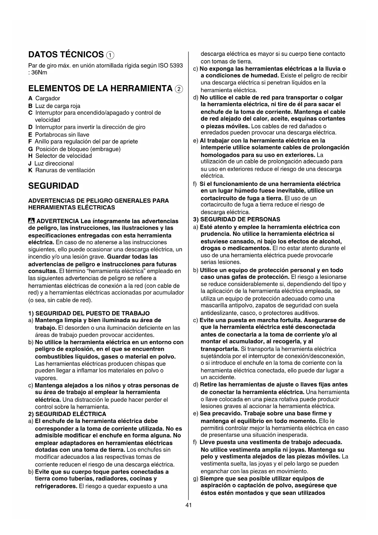 A Cargador B Luz de carga roja C Interruptor para encendido/apagado y control de velocidad D Interruptor para invertir la dirección de giro E Portabrocas sin llave F Anillo para regulación del par de apriete G Posición de bloqueo (embrague) H Selector de velocidad J Luz direccional K Ranuras de ventilación SEGURIDAD