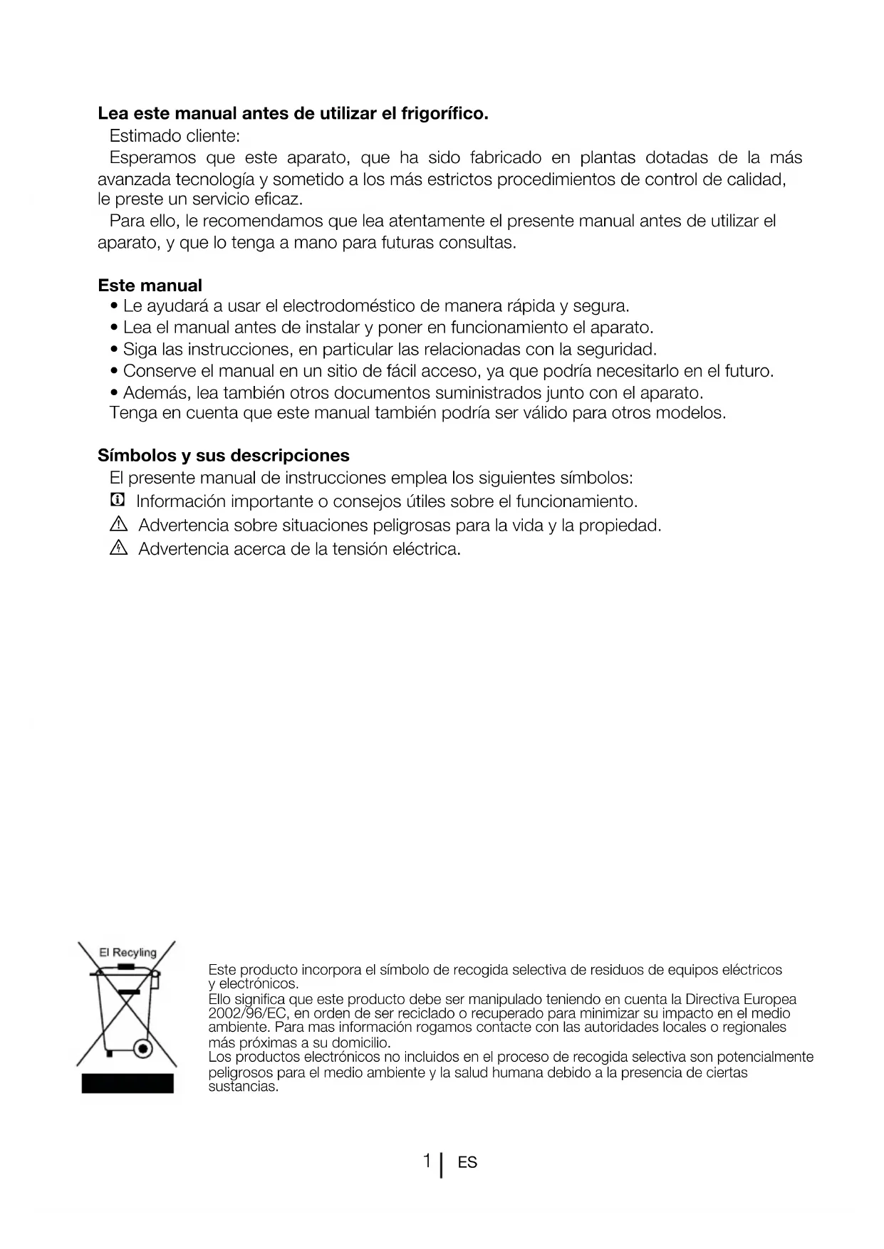 Lea este manual antes de utilizar el frigorífico. Estimado cliente: Esperamos que este aparato, que ha sido fabricado en plantas dotadas de la más avanzada tecnología y sometido a los más estrictos procedimientos de control de calidad, le preste un servicio eficaz. Para ello, le recomendamos que lea atentamente el presente manual antes de utilizar el aparato, y que lo tenga a mano para futuras consultas. Este manual