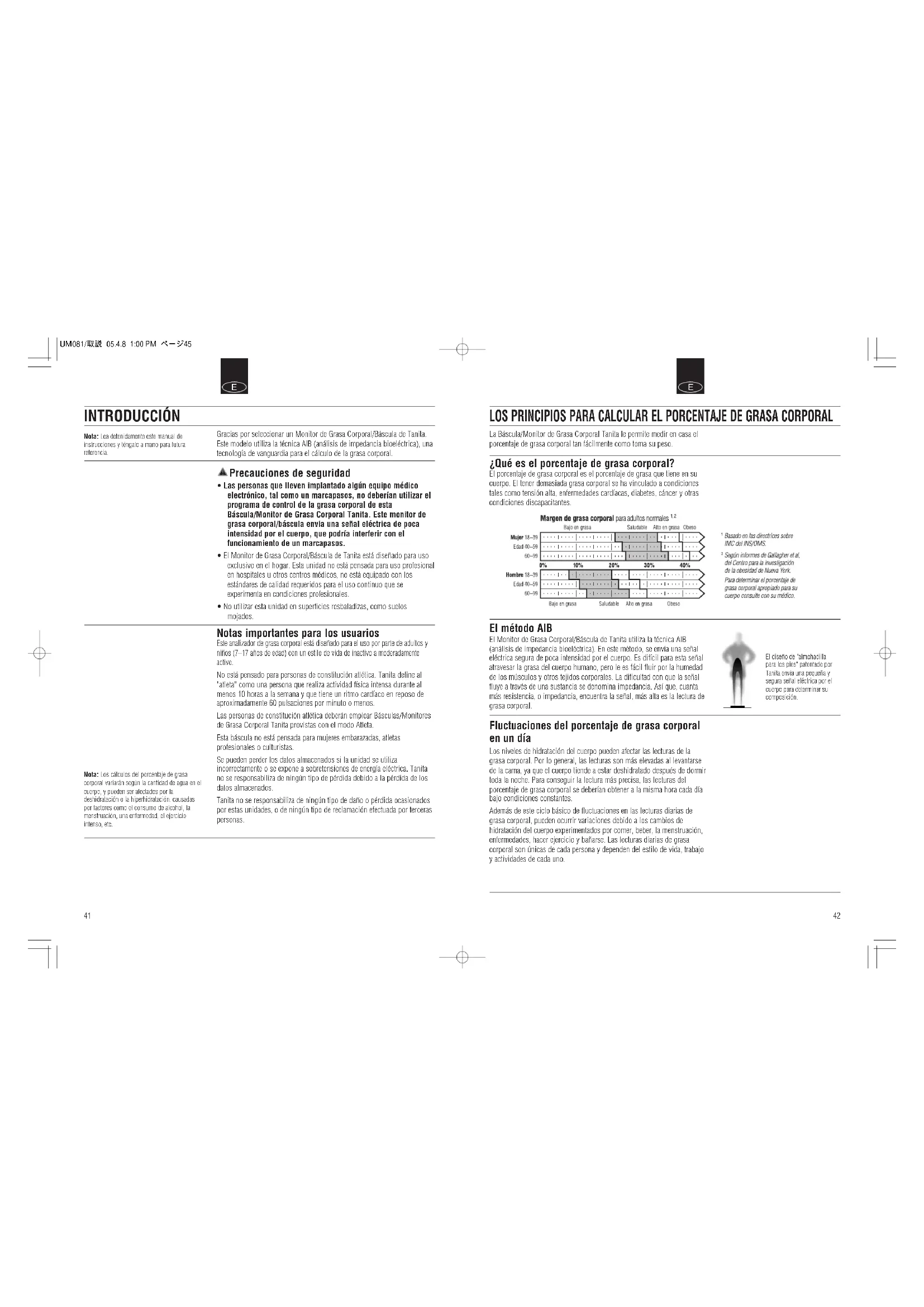 - No utilizar esta unidad en superficies resbaladizas, como suelos mojados. Notas importantes para los usuarios Este analizador de grasa corporal está diseñado para el uso por parte de adultos y niños (7–17 años de edad) con un estilo de vida de inactivo a moderadamente activo. No está pensado para personas de constitución atlética. Tanita define al "atleta" como una persona que realiza actividad física intensa durante al menos 10 horas a la semana y que tiene un ritmo cardíaco en reposo de aproximadamente 60 pulsaciones por minuto o menos. Las personas de constitución atlética deberán emplear Básculas/Monitores de Grasa Corporal Tanita provistas con el modo Atleta. Esta báscula no está pensada para mujeres embarazadas, atletas profesionales o culturistas. Se pueden perder los datos almacenados si la unidad se utiliza incorrectamente o se expone a sobretensiones de energía eléctrica. Tanita no se responsabiliza de ningún tipo de pérdida debido a la pérdida de los datos almacenados. Tanita no se responsabiliza de ningún tipo de daño o pérdida ocasionados por estas unidades, o de ningún tipo de reclamación efectuada por terceras personas. Nota: Lea detenidamente este manual deinstrucciones y téngalo a mano para futurareferencia.Nota: Los cálculos del porcentaje de grasacorporal variarán según la cantidad de agua en elcuerpo, y pueden ser afectados por ladeshidratación o la hiperhidratación, causadaspor factores como el consumo de alcohol, lamenstruación, una enfermedad, el ejerciciointenso, etc. UM081/取説05.4.81:00PMページ45EE