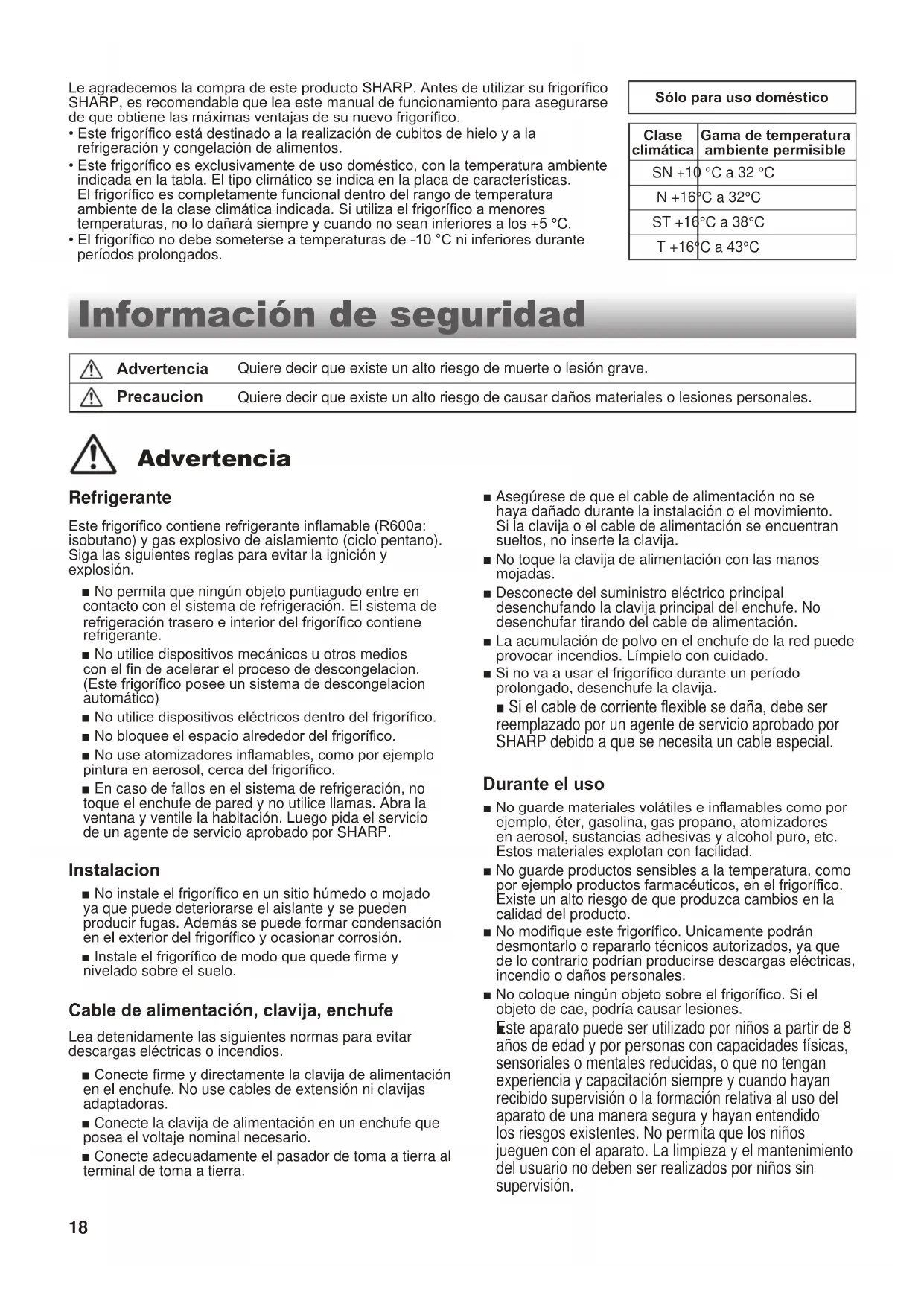 Este aparato puede ser utilizado por niños a partir de 8 años de edad y por personas con capacidades físicas, sensoriales o mentales reducidas, o que no tengan experiencia y capacitación siempre y cuando hayan recibido supervisión o la formación relativa al uso del aparato de una manera segura y hayan entendido los riesgos existentes. No permita que los niños jueguen con el aparato. La limpieza y el mantenimiento del usuario no deben ser realizados por niños sin supervisión. Clase climática Gama de temperatura ambiente permisible SN +10 °C a 32 °C N +16°C a 32°C ST +16°C a 38°C T +16°C a 43°C Información de seguridad Advertencia Quiere decir que existe un alto riesgo de muerte o lesión grave. Precaucion Quiere decir que existe un alto riesgo de causar daños materiales o lesiones personales. Advertencia (B656)W_1.indb 18 2015/05/22 14:59:3819 Cuidados y limpieza ■ Desenchufeprimeroelfrigorícoparaevitardescargas eléctricas. ■ No vierta agua directamente en el compartimiento exterior ni en el interior. Esto puede producir la oxidación y deterioro del aislamiento eléctrico. Problema ■ Si percibe un olor a quemado, desenchufe inmediatamente la clavija de alimentación. A continuación, solicite a un agente de servicio aprobado de SHARP que realice el servicio. ■ En caso de que haya fugas de gas, ventile el área abriendounaventana.Notoqueelfrigoríconiel enchufe de alimentación. Desecho ■ Asegúresedequeelfrigoríconorepresenteningún peligro para los niños al ser almacenado para su desecho. (por ejemplo, quite el cierre magnético de la puerta para prevenir que queden atrapados los niños) ■ Sedebedesecharestefrigorícodeformaapropiada. Lleveelfrigorícoaunaplantadereciclajeprofesional pararefrigerantesinamablesygasesexplosivosde aislamiento. Transporte ■ Cuandoinstaleomuevasufrigoríco,useunaestera endurecida para proteger el suelo contra daños. ■ Cargueelfrigorícososteníendoloporlasasas localizadas al frente y detrás. Sielevaelfrigorícoincorrectamente,podríasufrir lesiones. Precaucion Durante el uso ■ No toque la unidad del compresor o sus piezas periféricas ya que pueden volverse muy calientes durante el funcionamiento y los bordes de metal pueden provocar heridas. ■ No toque los alimentos o recipientes de metal del compartimiento congelador con las manos mojadas. Esto puede causar congelamiento. ■ No coloque bebidas en botella ni en lata en el compartimento del congelador. Especialmente si “Enfriamiento rápido” está en funcionamiento, existe un alto riesgo de que las botellas de cristal exploten. ■ Al elaborar cubitos de hielo, use solamente agua potable. ■ No abra ni cierre la puerta si alguna persona ha colocado sus manos cerca de la puerta. Existe el riesgo de que los dedos de la otra persona queden atrapados en la puerta. ■ No introduzca objetos de gran tamaño en los contenedores de la puerta. Si el objeto se cae del contenedor, podría causar lesiones. detrás al frente Indicador de temperatura Estefrigorícoestáequipadoconunindicadordetemperaturaenelcompartimientodelfrigorícoquepermitecontrolar la temperatura media en la zona más fría. Zona más fría El símbolo indica la zona más fría en el compartimientodelfrigoríco.(Elcompartimiento de la puerta colocada a la misma altura no es la zona más fría). Comprobación de la temperatura en la zona más fría Puede llevar a cabo comprobaciones regulares para asegurar que la temperatura en la zona más fría es la correcta, en caso necesario, ajuste el control de temperaturadelfrigoríco. Para mantener la temperatura correcta dentro del electrodoméstico, compruebe que el indicador de temperatura esté siempre AZUL. Si el indicador de temperatura se vuelve BLANCO, la temperatura es demasiado alta; en este caso, aumente el ajuste del control delatemperaturadelfrigorícoyespere6horasantesde controlar el indicador de temperatura de nuevo. NOTAS