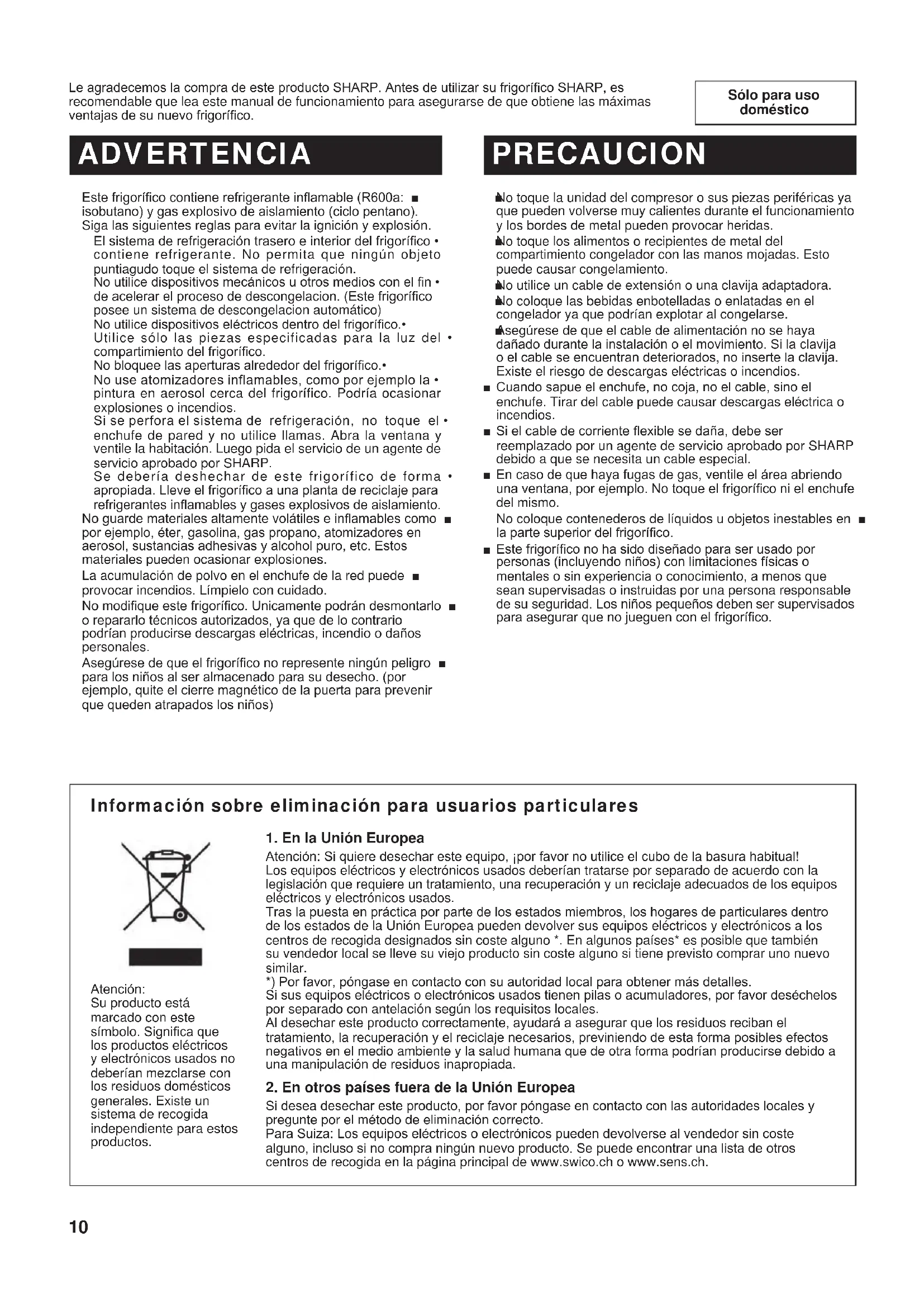 (B246)-W.indb 9 2011/08/30 22:05:1710 Sólo para uso doméstico Le agradecemos la compra de este producto SHARP. Antes de utilizar su frigoríco SHARP, es recomendable que lea este manual de funcionamiento para asegurarse de que obtiene las máximas ventajas de su nuevo frigoríco. Este frigoríco contiene refrigerante inamable (R600a: ■ isobutano) y gas explosivo de aislamiento (ciclo pentano). Siga las siguientes reglas para evitar la ignición y explosión. El sistema de refrigeración trasero e interior del frigoríco • contiene refrigerante. No permita que ningún objeto puntiagudo toque el sistema de refrigeración. No utilice dispositivos mecánicos u otros medios con el n • de acelerar el proceso de descongelacion. (Este frigoríco posee un sistema de descongelacion automático) No utilice dispositivos eléctricos dentro del frigoríco.• Utilice sólo las piezas especificadas para la luz del • compartimiento del frigoríco. No bloquee las aperturas alrededor del frigoríco.• No use atomizadores inflamables, como por ejemplo la • pintura en aerosol cerca del frigorífico. Podría ocasionar explosiones o incendios. Si se perfora el sistema de refrigeración, no toque el • enchufe de pared y no utilice llamas. Abra la ventana y ventile la habitación. Luego pida el servicio de un agente de servicio aprobado por SHARP. Se debería deshechar de este frigorífico de forma • apropiada. Lleve el frigoríco a una planta de reciclaje para refrigerantes inamables y gases explosivos de aislamiento. No guarde materiales altamente volátiles e inamables como ■ por ejemplo, éter, gasolina, gas propano, atomizadores en aerosol, sustancias adhesivas y alcohol puro, etc. Estos materiales pueden ocasionar explosiones. La acumulación de polvo en el enchufe de la red puede ■ provocar incendios. Límpielo con cuidado. No modique este frigoríco. Unicamente podrán desmontarlo ■ o repararlo técnicos autorizados, ya que de lo contrario podrían producirse descargas eléctricas, incendio o daños personales. Asegúrese de que el frigoríco no represente ningún peligro ■ para los niños al ser almacenado para su desecho. (por ejemplo, quite el cierre magnético de la puerta para prevenir que queden atrapados los niños) ADVERTENCIA PRECAUCION No toque la unidad del compresor o sus piezas periféricas ya ■ que pueden volverse muy calientes durante el funcionamiento y los bordes de metal pueden provocar heridas. No toque los alimentos o recipientes de metal del ■ compartimiento congelador con las manos mojadas. Esto puede causar congelamiento. No utilice un cable de extensión o una clavija adaptadora. ■ No coloque las bebidas enbotelladas o enlatadas en el ■ congelador ya que podrían explotar al congelarse. Asegúrese de que el cable de alimentación no se haya ■ dañado durante la instalación o el movimiento. Si la clavija o el cable se encuentran deteriorados, no inserte la clavija. Existe el riesgo de descargas eléctricas o incendios. Cuando sapue el enchufe, no coja, no el cable, sino el ■ enchufe. Tirar del cable puede causar descargas eléctrica o incendios. Si el cable de corriente exible se daña, debe ser ■ reemplazado por un agente de servicio aprobado por SHARP debido a que se necesita un cable especial. En caso de que haya fugas de gas, ventile el área abriendo ■ una ventana, por ejemplo. No toque el frigoríco ni el enchufe del mismo. No coloque contenederos de líquidos u objetos inestables en ■ la parte superior del frigoríco. Este frigoríco no ha sido diseñado para ser usado por ■ personas (incluyendo niños) con limitaciones físicas o mentales o sin experiencia o conocimiento, a menos que sean supervisadas o instruidas por una persona responsable de su seguridad. Los niños pequeños deben ser supervisados para asegurar que no jueguen con el frigoríco. Información sobre eliminación para usuarios particulares