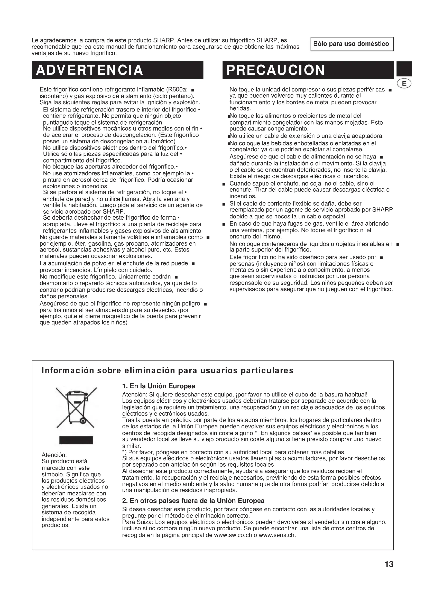 Refer to your nearest service agent approved by SHARP. (B245)-W.indb 12 2011/08/30 20:41:0913 Sólo para uso doméstico Le agradecemos la compra de este producto SHARP. Antes de utilizar su frigoríco SHARP, es recomendable que lea este manual de funcionamiento para asegurarse de que obtiene las máximas ventajas de su nuevo frigoríco. Este frigoríco contiene refrigerante inamable (R600a: ■ isobutano) y gas explosivo de aislamiento (ciclo pentano). Siga las siguientes reglas para evitar la ignición y explosión. El sistema de refrigeración trasero e interior del frigoríco • contiene refrigerante. No permita que ningún objeto puntiagudo toque el sistema de refrigeración. No utilice dispositivos mecánicos u otros medios con el n • de acelerar el proceso de descongelacion. (Este frigoríco posee un sistema de descongelacion automático) No utilice dispositivos eléctricos dentro del frigoríco.• Utilice sólo las piezas especicadas para la luz del • compartimiento del frigoríco. No bloquee las aperturas alrededor del frigoríco.• No use atomizadores inamables, como por ejemplo la • pintura en aerosol cerca del frigoríco. Podría ocasionar explosiones o incendios. Si se perfora el sistema de refrigeración, no toque el • enchufe de pared y no utilice llamas. Abra la ventana y ventile la habitación. Luego pida el servicio de un agente de servicio aprobado por SHARP. Se debería deshechar de este frigoríco de forma • apropiada. Lleve el frigoríco a una planta de reciclaje para refrigerantes inamables y gases explosivos de aislamiento. No guarde materiales altamente volátiles e inamables como ■ por ejemplo, éter, gasolina, gas propano, atomizadores en aerosol, sustancias adhesivas y alcohol puro, etc. Estos materiales pueden ocasionar explosiones. La acumulación de polvo en el enchufe de la red puede ■ provocar incendios. Límpielo con cuidado. No modique este frigoríco. Unicamente podrán ■ desmontarlo o repararlo técnicos autorizados, ya que de lo contrario podrían producirse descargas eléctricas, incendio o daños personales. Asegúrese de que el frigoríco no represente ningún peligro ■ para los niños al ser almacenado para su desecho. (por ejemplo, quite el cierre magnético de la puerta para prevenir que queden atrapados los niños) ADVERTENCIA PRECAUCION No toque la unidad del compresor o sus piezas periféricas ■ ya que pueden volverse muy calientes durante el funcionamiento y los bordes de metal pueden provocar heridas. No toque los alimentos o recipientes de metal del ■ compartimiento congelador con las manos mojadas. Esto puede causar congelamiento. No utilice un cable de extensión o una clavija adaptadora. ■ No coloque las bebidas enbotelladas o enlatadas en el ■ congelador ya que podrían explotar al congelarse. Asegúrese de que el cable de alimentación no se haya ■ dañado durante la instalación o el movimiento. Si la clavija o el cable se encuentran deteriorados, no inserte la clavija. Existe el riesgo de descargas eléctricas o incendios. Cuando sapue el enchufe, no coja, no el cable, sino el ■ enchufe. Tirar del cable puede causar descargas eléctrica o incendios. Si el cable de corriente exible se daña, debe ser ■ reemplazado por un agente de servicio aprobado por SHARP debido a que se necesita un cable especial. En caso de que haya fugas de gas, ventile el área abriendo ■ una ventana, por ejemplo. No toque el frigoríco ni el enchufe del mismo. No coloque contenederos de líquidos u objetos inestables en ■ la parte superior del frigoríco. Este frigoríco no ha sido diseñado para ser usado por ■ personas (incluyendo niños) con limitaciones físicas o mentales o sin experiencia o conocimiento, a menos que sean supervisadas o instruidas por una persona responsable de su seguridad. Los niños pequeños deben ser supervisados para asegurar que no jueguen con el frigoríco. Información sobre eliminación para usuarios particulares