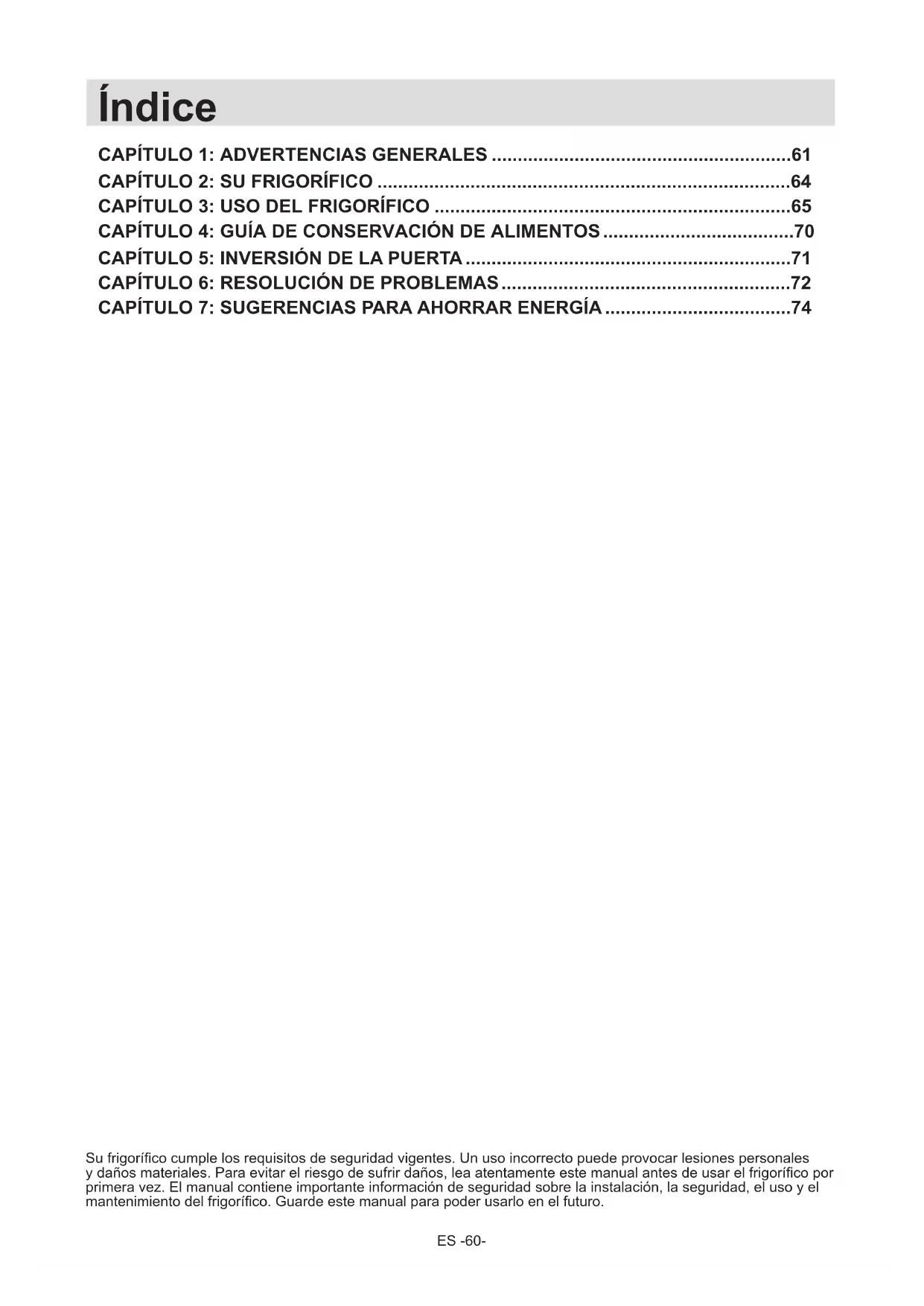 Su frigoríco cumple los requisitos de seguridad vigentes. Un uso incorrecto puede provocar lesiones personales y daños materiales. Para evitar el riesgo de sufrir daños, lea atentamente este manual antes de usar el frigoríco por primera vez. El manual contiene importante información de seguridad sobre la instalación, la seguridad, el uso y el mantenimiento del frigoríco. Guarde este manual para poder usarlo en el futuro. Índice