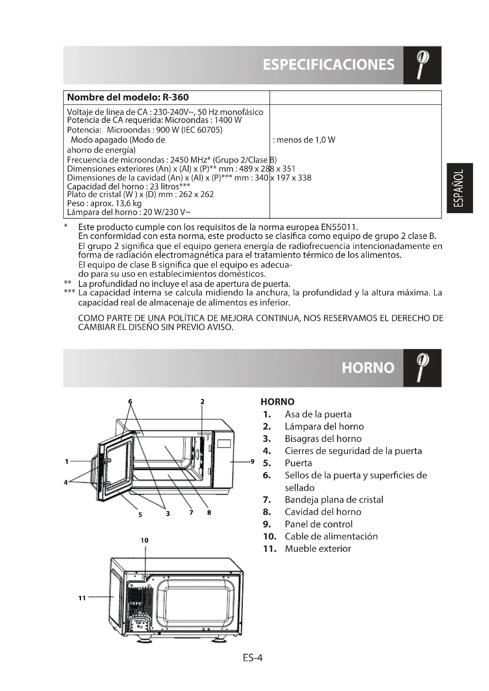 Las microondas son ondas de energía, simi- lares a las utilizadas por las señales de tele- visión y de radio. La energía eléctrica se convierte en energía de microondas, que se dirige a la parte in- ferior central de la cavidad a través de un guiaondas. A continuación, el agitador del microondas distribuye la energía de mi- croondas hacia todas las esquinas de la ca- vidad de manera uniforme. Las microondas no pueden atravesar el me- tal. Por este motivo, la cavidad del horno se fabrica de este material y se utiliza una na malla de metal en la puerta. Durante la cocción, las microondas rebotan desde los lados de la cavidad del horno de manera aleatoria. Las microondas atraviesan determinados materiales, como el cristal y el plástico, para calentar los alimentos ES-23). El agua, el azúcar y la grasa de los alimen- tos absorben las microondas y provocan su vibración, lo que crea calor por fricción, de la misma forma que se calientan las manos cuando se frotan entre sí. La energía de microondas calienta la parte ex- terior de los alimentos y, a continuación, el ca- lor se traslada al centro por conducción, como ocurre en la cocción tradicional. Es importan- te girar, recolocar o mover los alimentos para garantizar un calentamiento uniforme. Una vez completada la cocción, el horno deja de producir automáticamente microondas. Se necesita un periodo de reposo tras la cocción para permitir que el calor se disperse de manera uniforme a través de todos los alimentos. NOTA: Este modelo utiliza una bandeja plana de cristal en lugar de un plato giratorio. La ban- deja plana de cristal está unida con pega- mento a la parte inferior de la cavidad y no da vueltas como un plato giratorio. Basta co- locar el plato en la bandeja de cristal plana.ES-3 Manual de instrucciones INFORMACIÓN SOBRE LA ELIMINACIÓN CORRECTA .............................................................................1 CATEGORÍA DE CALOR ......................................................................................................................................2 FUNCIONAMIENTO DEL HORNO ................................................................................................................... 2 CONTENIDOS ........................................................................................................................................................3 ESPECIFICACIONES ............................................................................................................................................4 HORNO ...................................................................................................................................................................4 PANEL DE CONTROL ..........................................................................................................................................5 MEDIDAS IMPORTANTES DE SEGURIDAD ...........................................................................................6-13 INSTALACIÓN .............................................................................................................................................. 14-15 ANTES DE USAR ............................................................................................................................................... 16 AJUSTE DEL RELOJ ......................................................................................................................................... 16 FUNCIÓN DE TEMPORIZADOR DE COCINA ..................................................................................... 16-17 NIVELES DE POTENCIA DE MICROONDAS ..............................................................................................17 FUNCIONAMIENTO MANUAL ..................................................................................................................... 18 COCINAR CON EL MICROONDAS ........................................................................................................ 18-19 OTRAS FUNCIONES PRÁCTICAS ................................................................................................................ 19 FUNCIÓN DE DESCONGELACIÓN POR PESO ........................................................................................ 20 FUNCIÓN DE DESCONGELACIÓN POR TIEMPO ................................................................................... 20 FUNCIÓN DE AUTO MENÚ ........................................................................................................................... 21 TABLA DE AUTO MENÚ ........................................................................................................................... 21-22 UTENSILIOS ADECUADOS PARA EL HORNO .......................................................................................... 23 CUIDADO Y LIMPIEZA ................................................................................................................................... 24 RESOLUCIÓN DE PROBLEMAS .............................................................................................................. 25-26 LLAMAR AL SERVICIO TÉCNICO .................................................................................................................... I ÍNDICEES-4 ESPAÑOL ESPECIFICACIONES HORNO Nombre del modelo: R-360 Voltaje de línea de CA : 230-240V~, 50Hz monofásicoPotencia de CA requerida: Microondas : 1400WPotencia: Microondas : 900W (IEC 60705) Modo apagado (Modo de ahorro de energía): menos de 1,0WFrecuencia de microondas : 2450MHz* (Grupo 2/Clase B)Dimensiones exteriores (An) x (Al) x (P)**mm : 489 x 288 x 351Dimensiones de la cavidad (An) x (Al) x (P)***mm : 340 x 197 x 338Capacidad del horno : 23 litros***Plato de cristal (W ) x (D) mm : 262 x 262Peso : aprox. 13,6 kgLámpara del horno : 20W/230V~* Este producto cumple con los requisitos de la norma europea EN55011. En conformidad con esta norma, este producto se clasica 