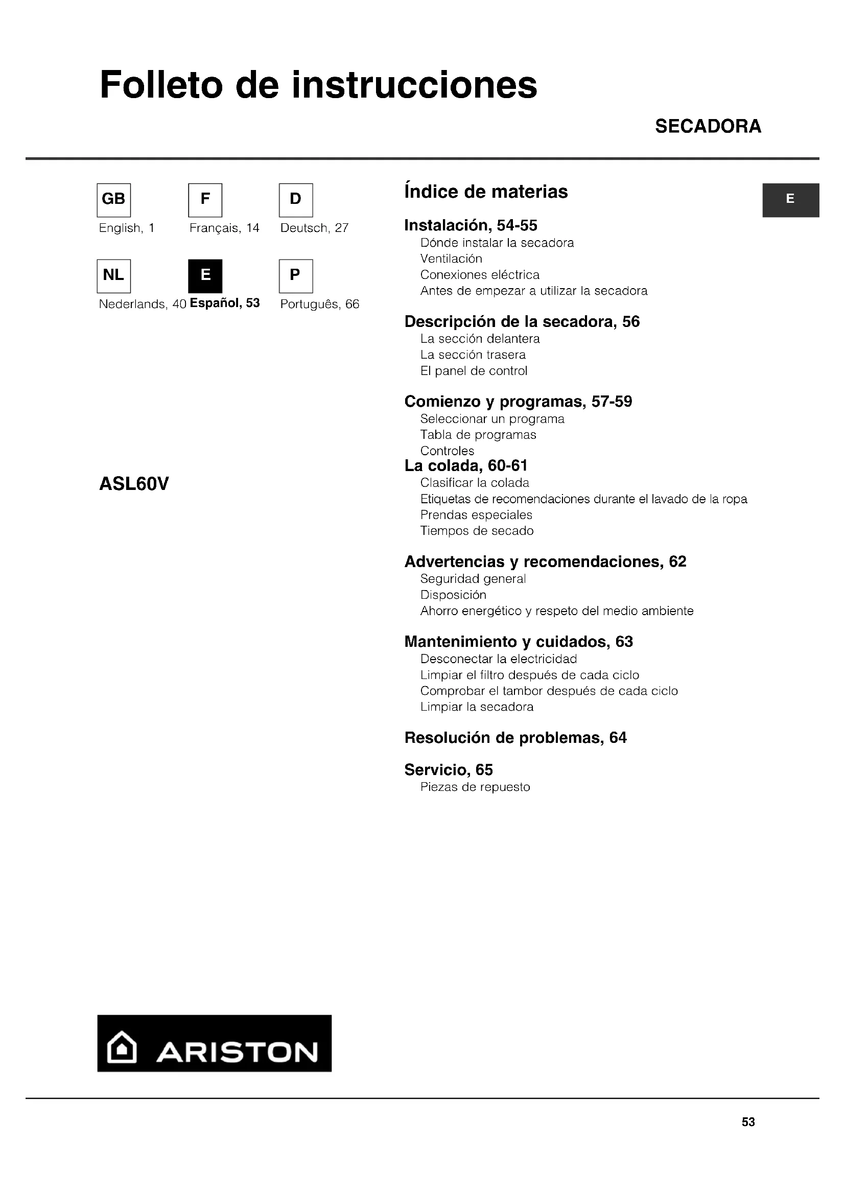Português, 66 Índice de materias SECADORA Folleto de instrucciones Instalación, 54-55 Dónde instalar la secadora Ventilación Conexiones eléctrica Antes de empezar a utilizar la secadora Descripción de la secadora, 56 La sección delantera La sección trasera El panel de control Comienzo y programas, 57-59 Seleccionar un programa Tabla de programas Controles La colada, 60-61 Clasificar la colada Etiquetas de recomendaciones durante el lavado de la ropa Prendas especiales Tiempos de secado Advertencias y recomendaciones, 62 Seguridad general Disposición Ahorro energético y respeto del medio ambiente Mantenimiento y cuidados, 63 Desconectar la electricidad Limpiar el filtro después de cada ciclo Comprobar el tambor después de cada ciclo Limpiar la secadora Resolución de problemas, 64 Servicio, 65 Piezas de repuesto