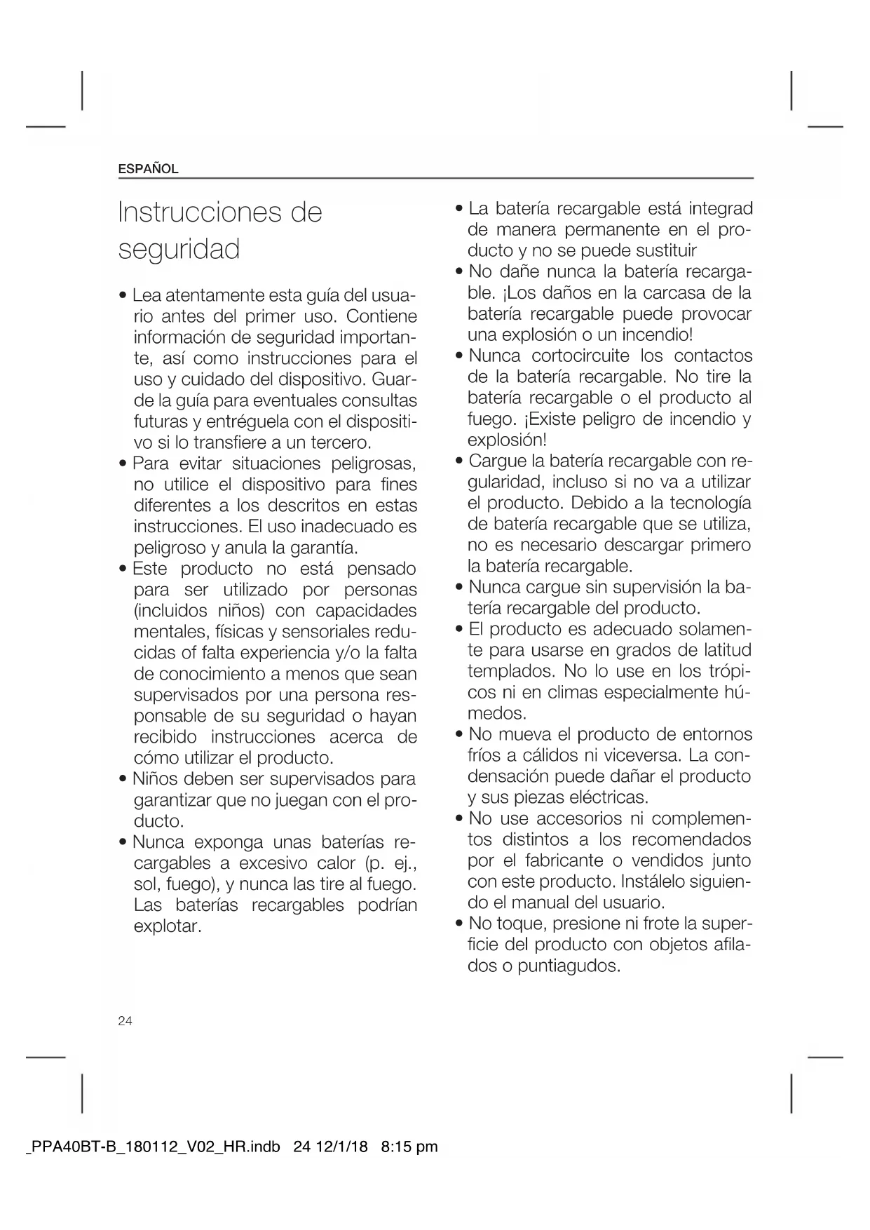 - Lea esta guía del usuario cuidado- samente para evitar daños o lesio- nes debido a un uso inadecuado. Por favor ponga especial atención a las instrucciones de seguridad. IM_PPA40BT-B_180112_V02_HR.indb 26 12/1/18 8:15 pm27 ESPAÑOL
